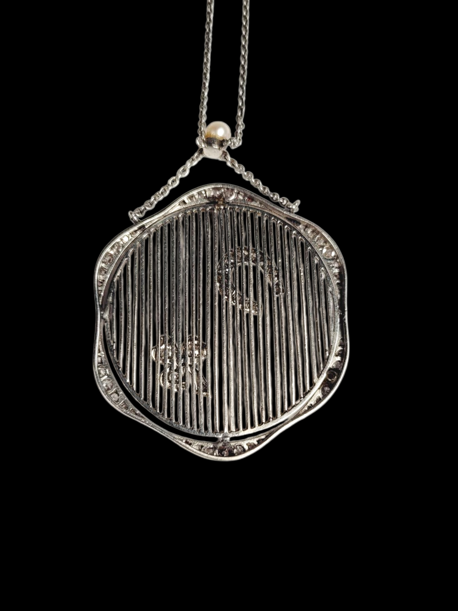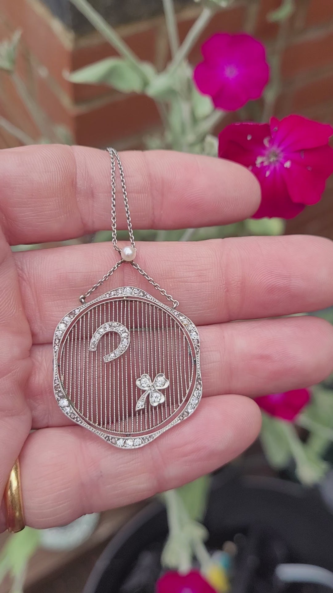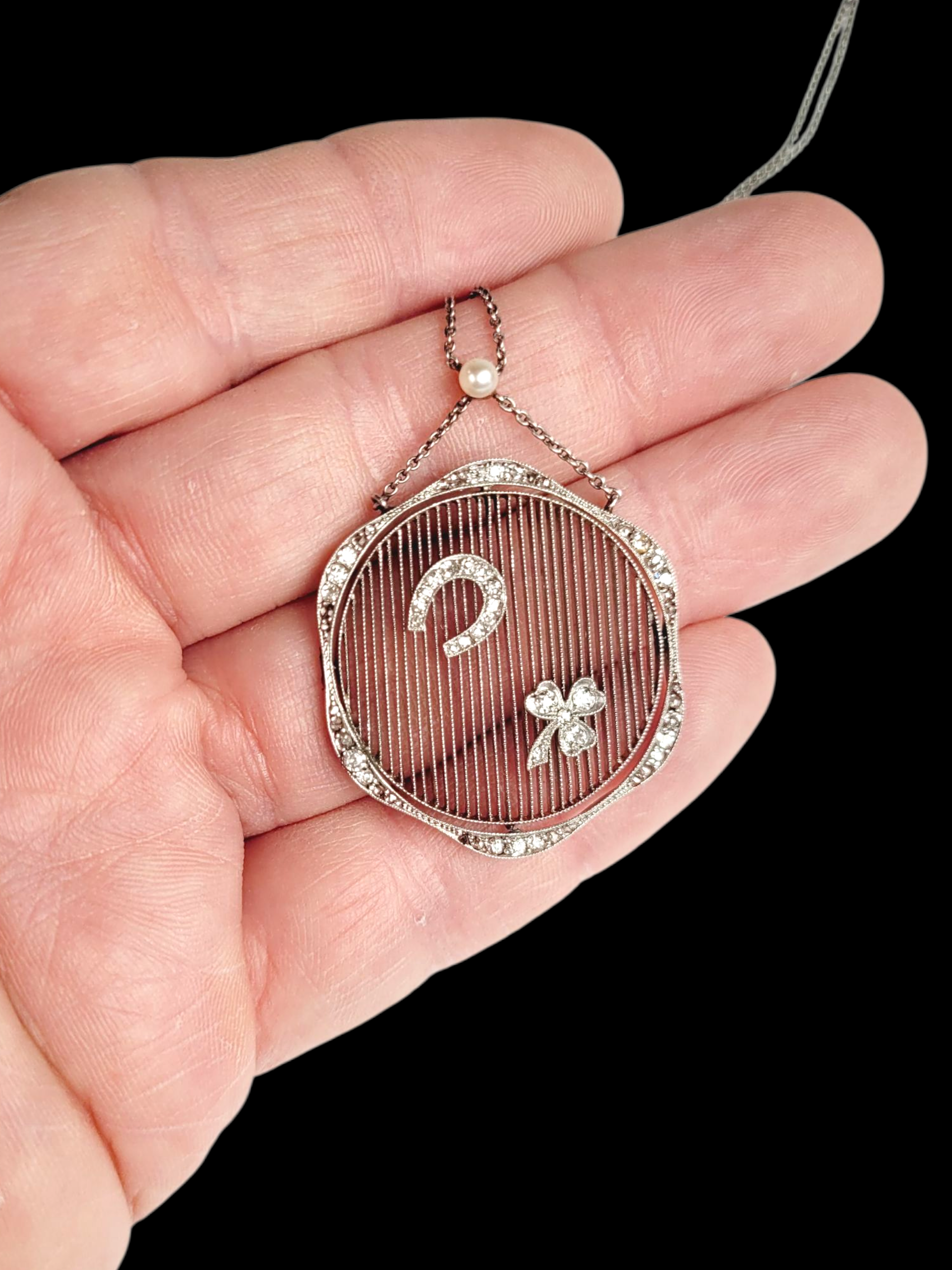 Art deco lucky charm pendant. 1920's hexagonal pendant with old cut diamond border around a fine wire field and a diamond horseshoe and shamrock lucky charm applied. 35mm diameter. Platinum 15 inch trace chain.