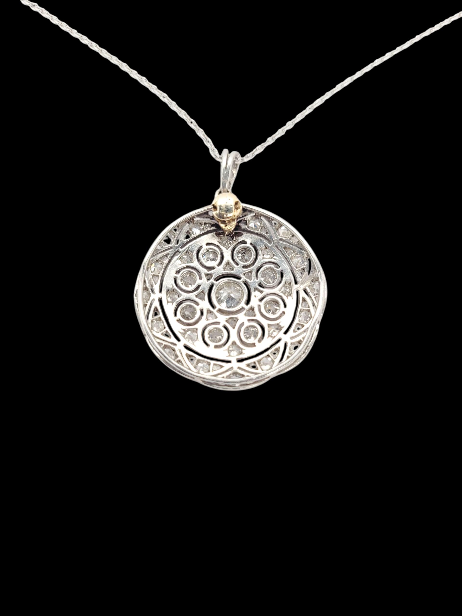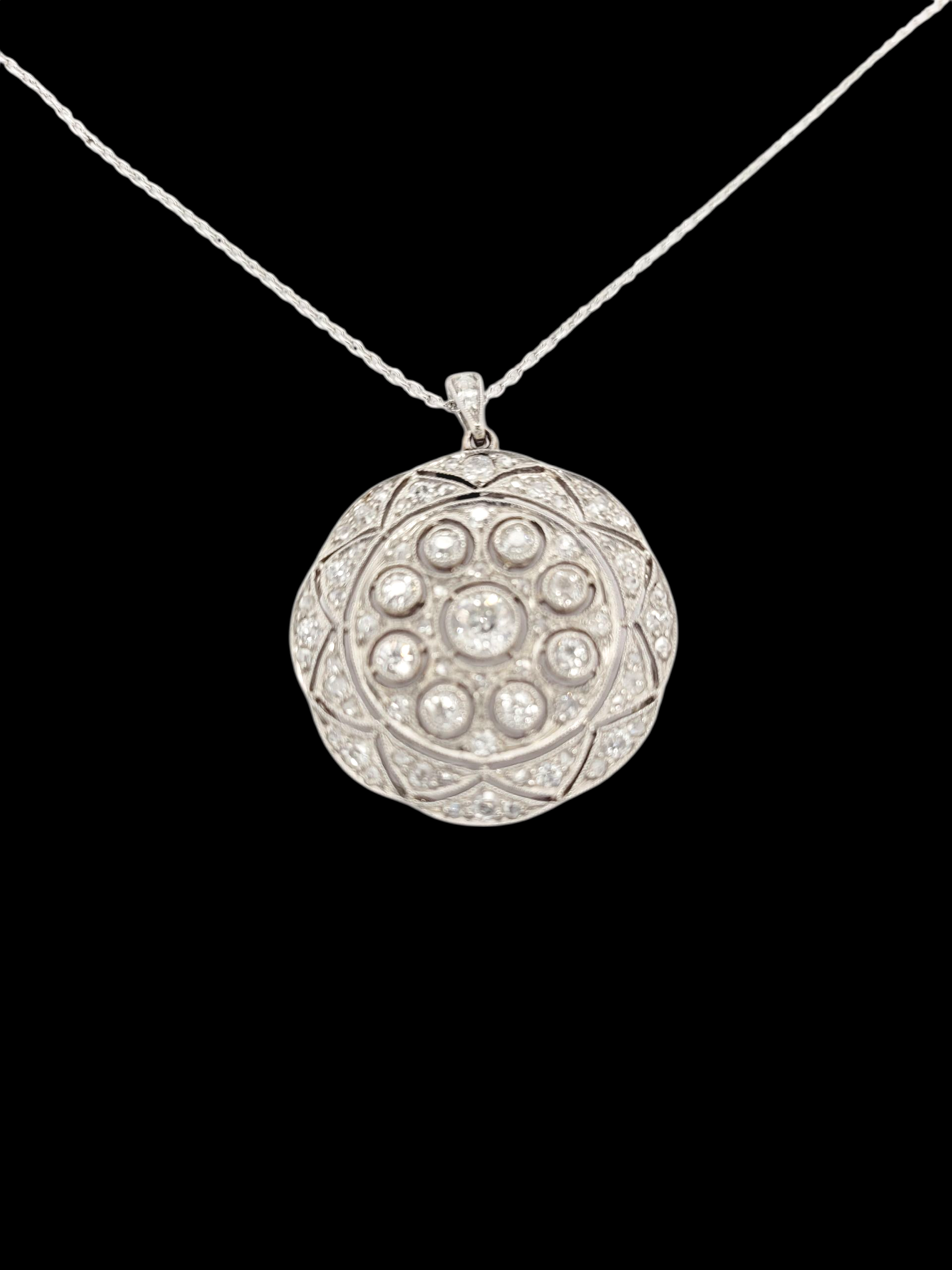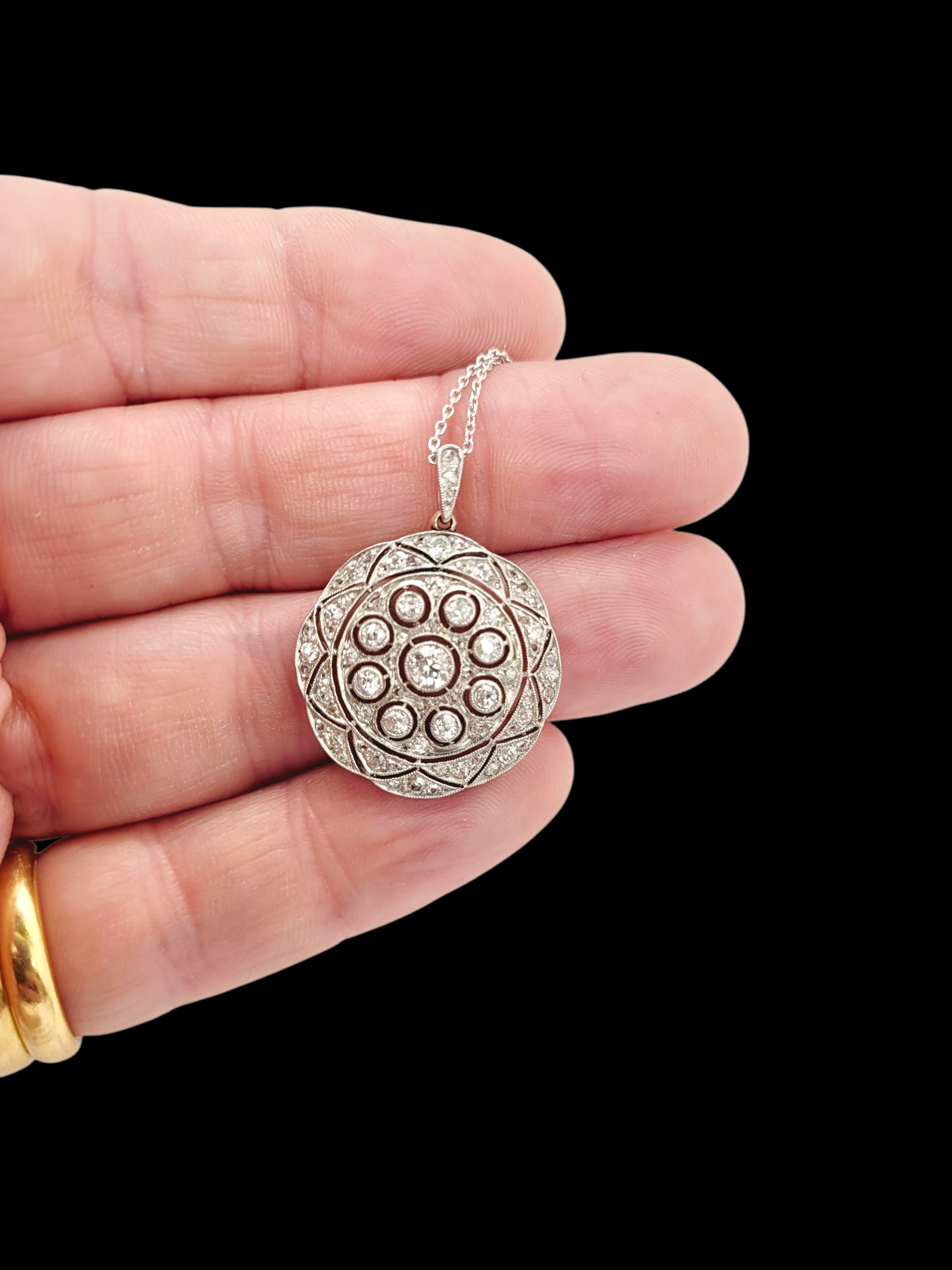 Belle epoque Islamic designed geometric platinum milgrain and openwork old European transitional cut and rose cut diamond pendant French circa 1908. 0.90cts 24mm diameter.