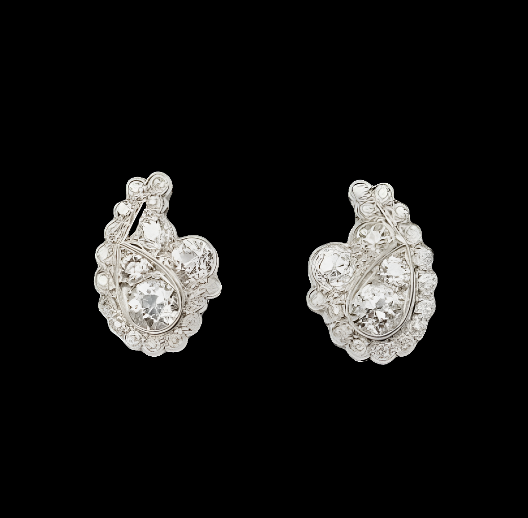 5cts of old mine cut diamonds set within a boteh 'paisley's design in platinum. English circa 1920. 20mm x 14.5mm