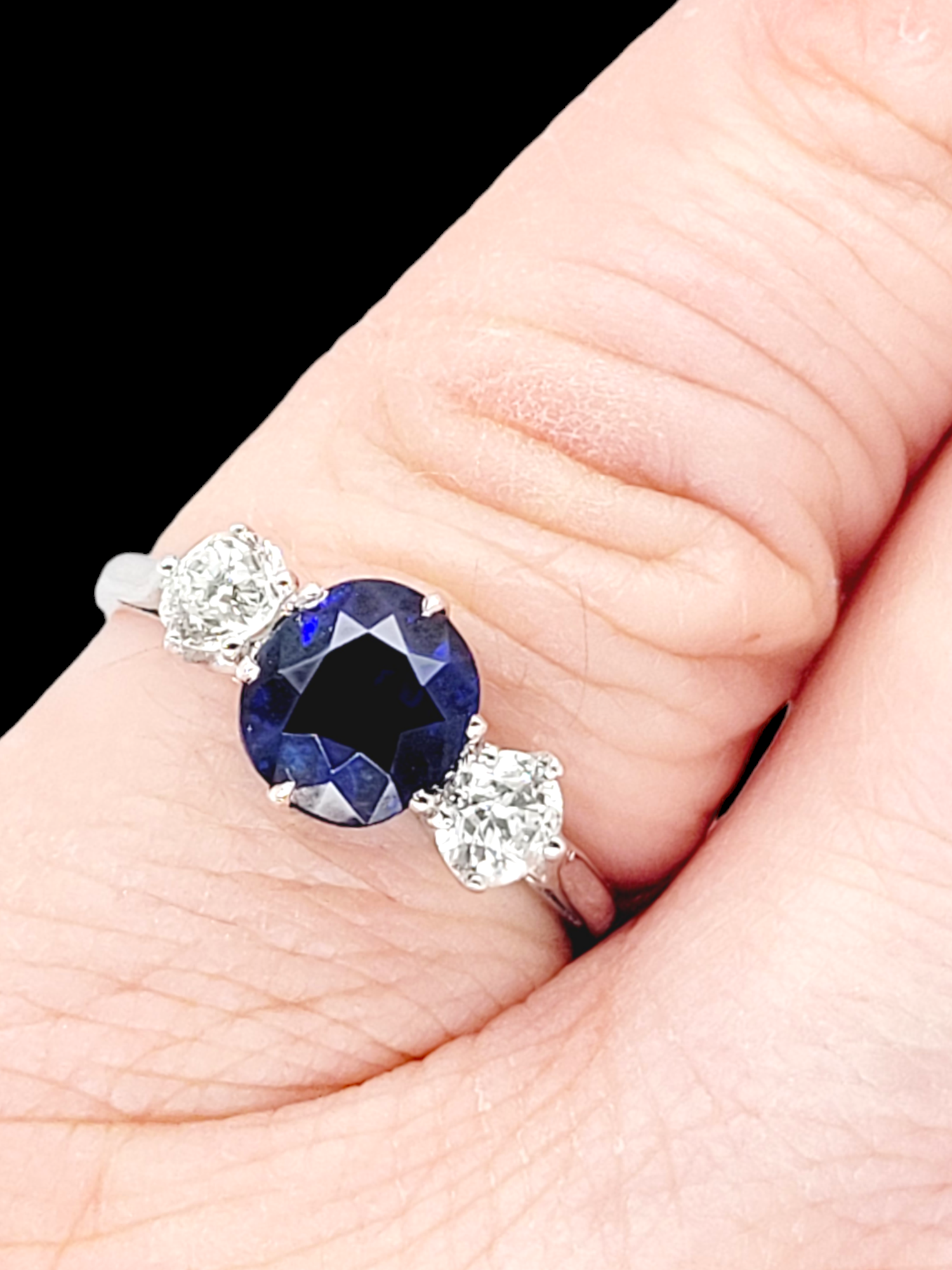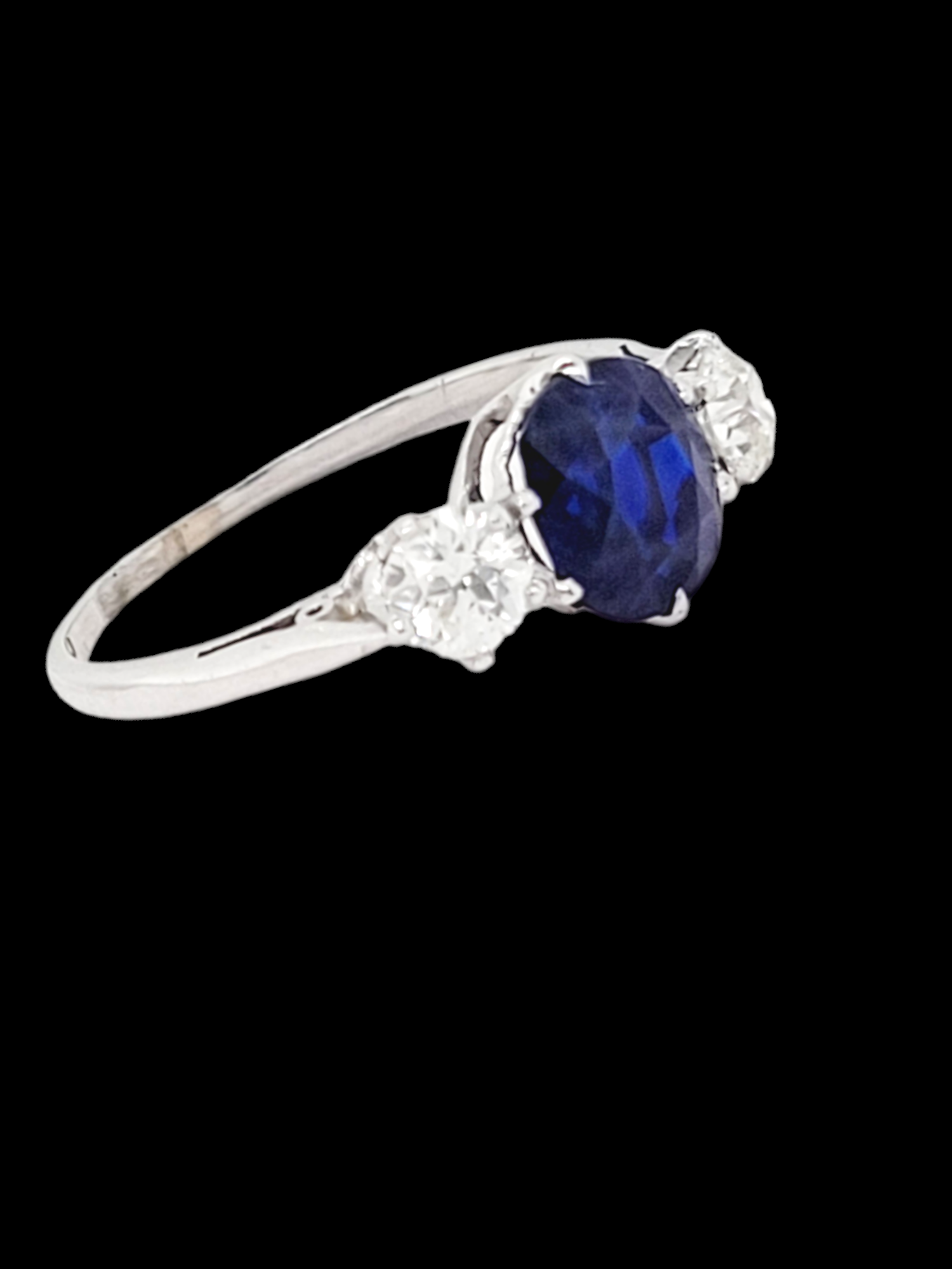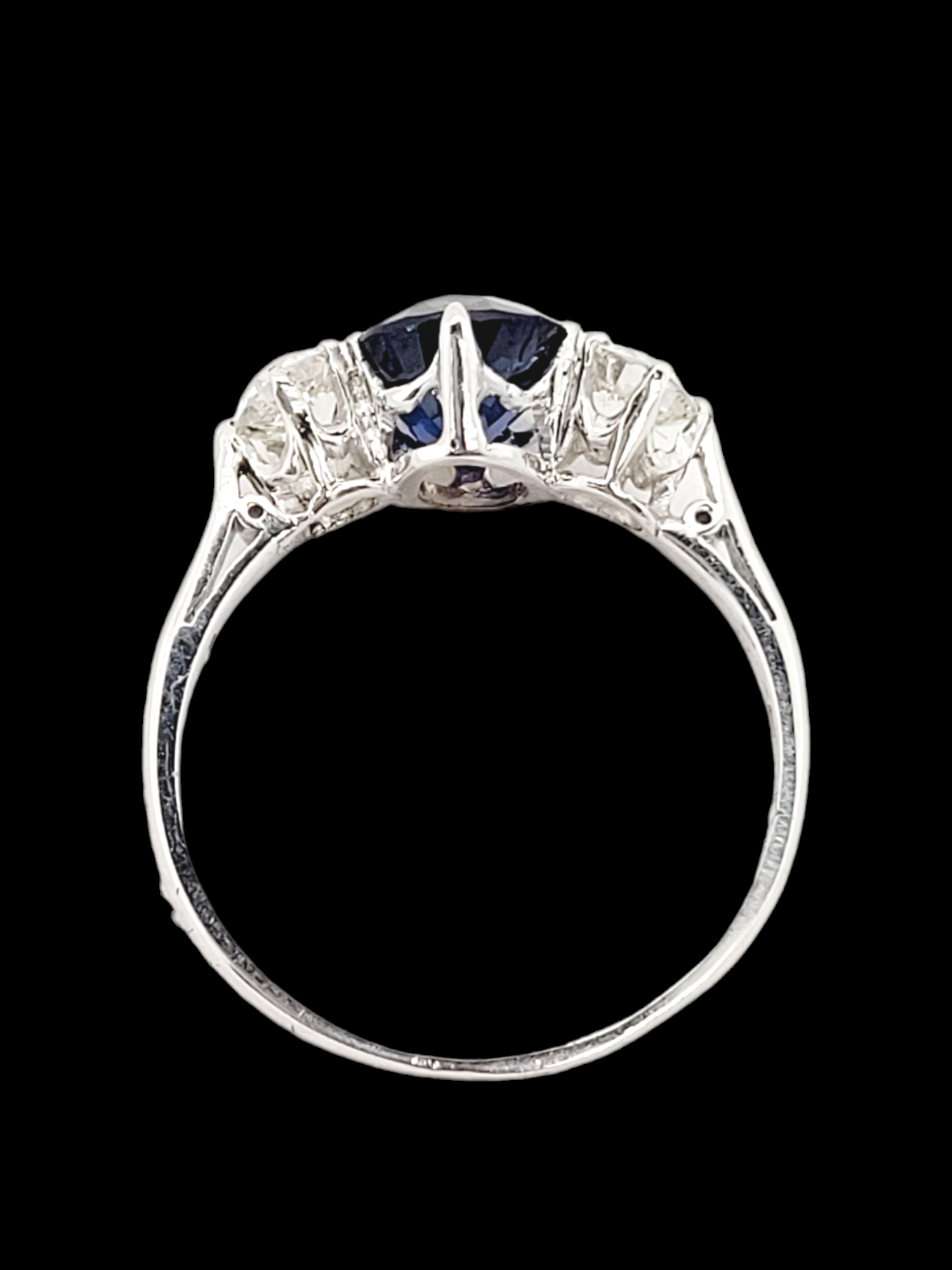 1.69ct 7.5mm x 6.8mm x 4.3mm oval Royal blue sapphire with 0.60cts of old mine cut diamonds H colour vs1 clarity. All set in platinum. Head size 14.5mm x 8mm. American circa 1920. Currently finger size N 1/2 (U.S 7)
