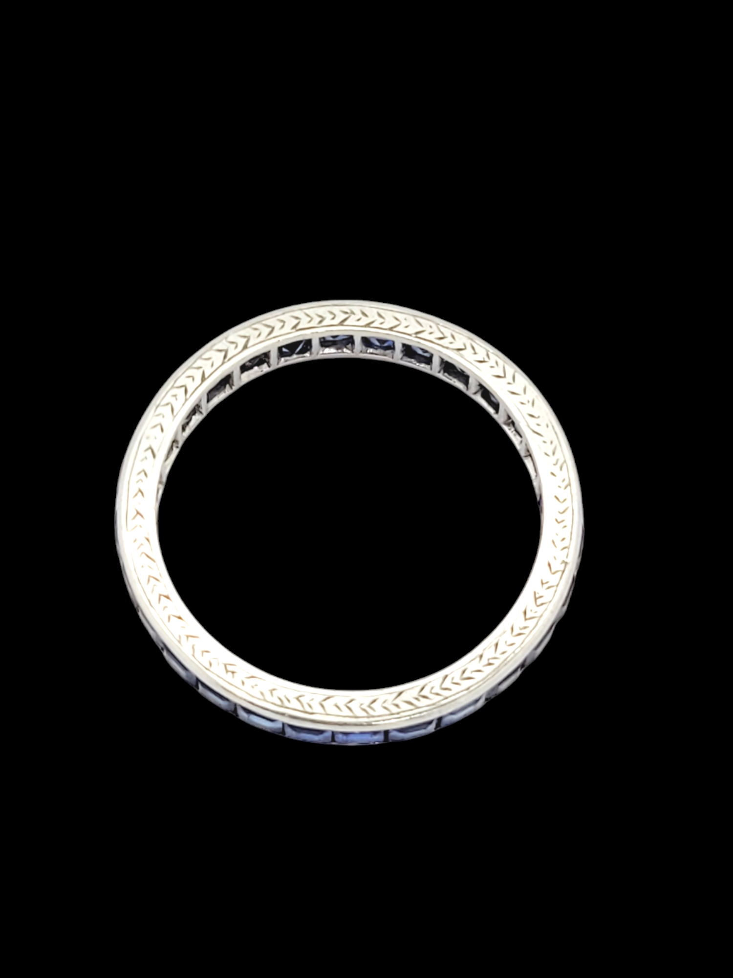 1.40cts of calibre natural sapphires set in platinum with engraved sides. 3mm wide, finger size N 1/2 (U.S 7). English circa 1920.