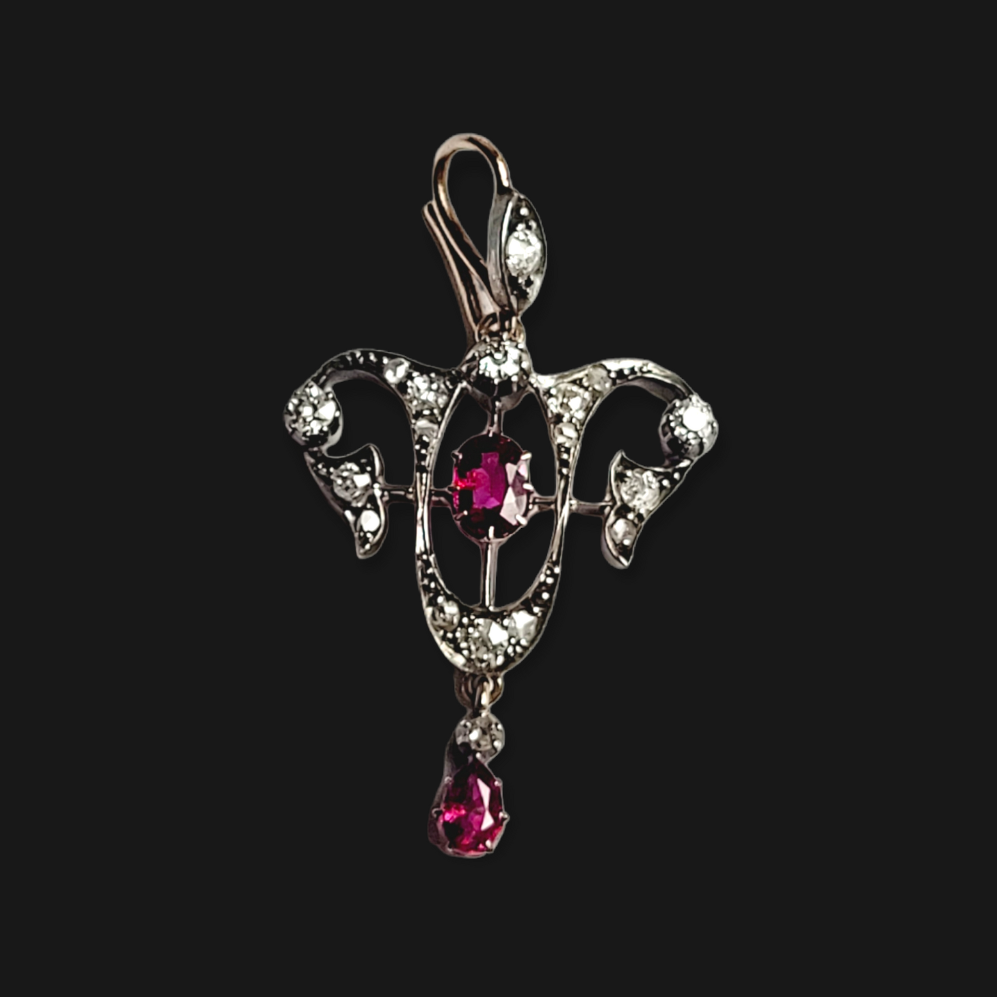 Gem rubies weighing approximately 0.85cts set with 0.50cts of old cut diamonds set in silver an 18ct gold. English circa 1870. 33mm x 25mm