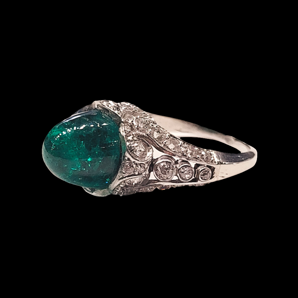 8.40ct high cabochon Colombian emerald set in an architectural platinum diamond art deco mount.