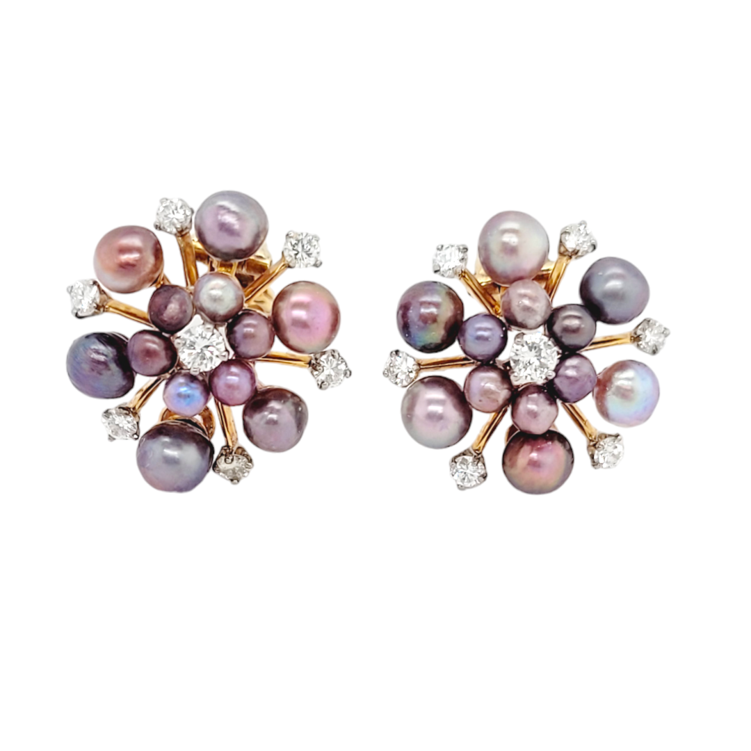 Fine natural black pearls of various hues 3mm and 5mm with 0.80cts of brilliant cut diamonds scattered within set in platinum with 18ct back and clip fittings. 19mm diameter. American circa 1940