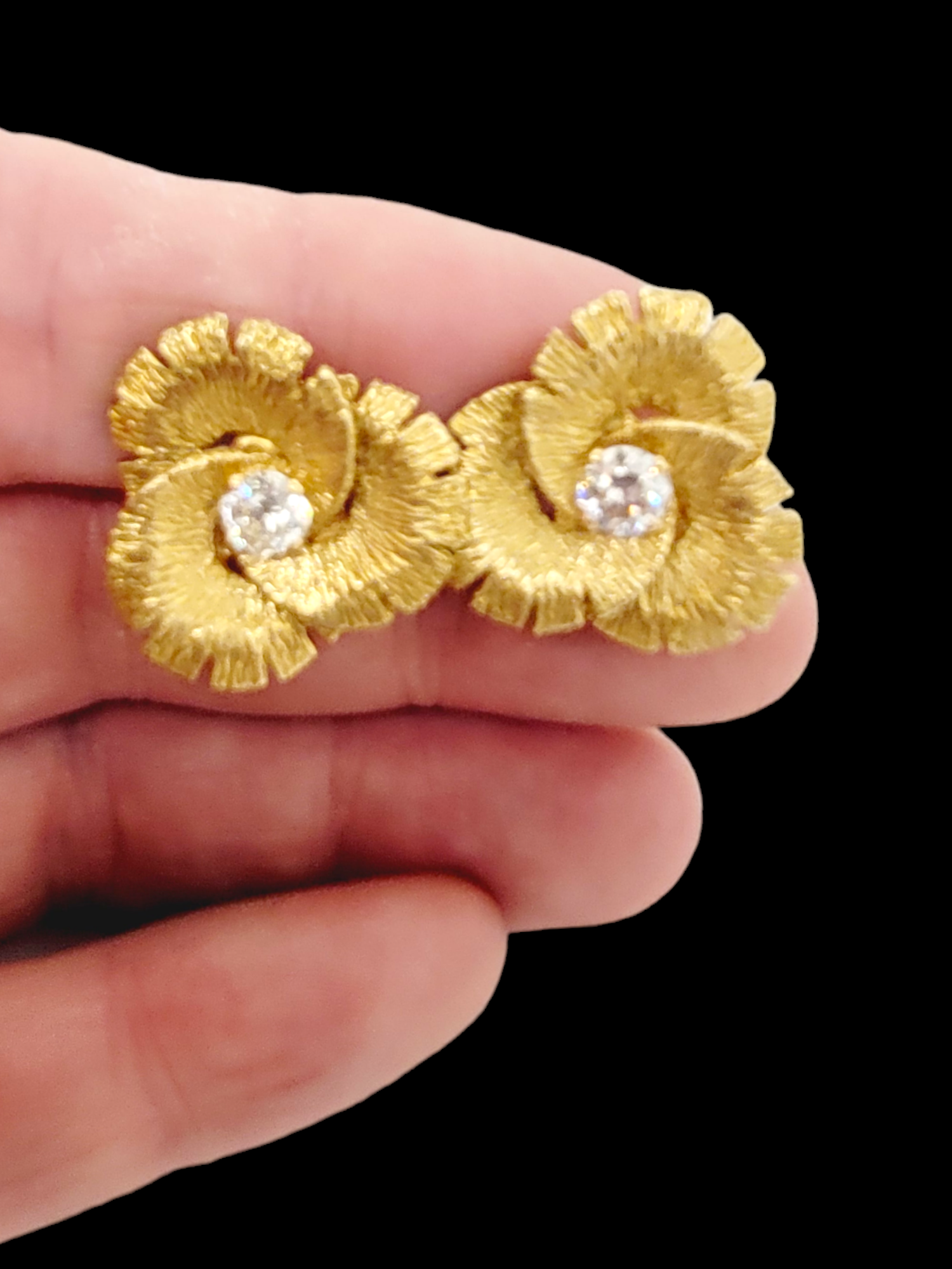 1.20ct of old European transitional cut diamonds set within buttery textured 18ct trefoil concentric design and softening stylised petals. 23.5mm diameter. Clip fittings, posts can be added if you wish. Scandinavian circa 1960