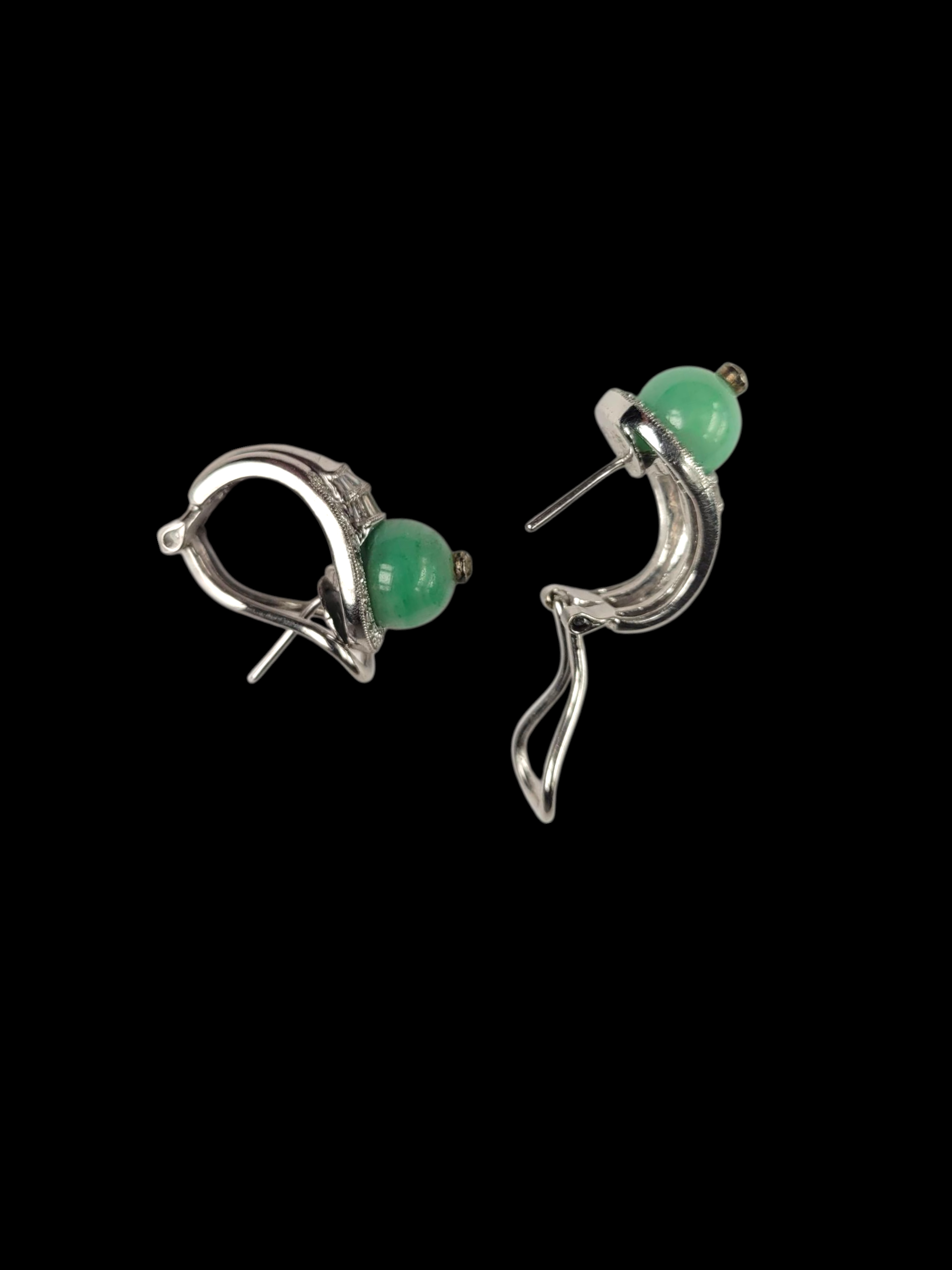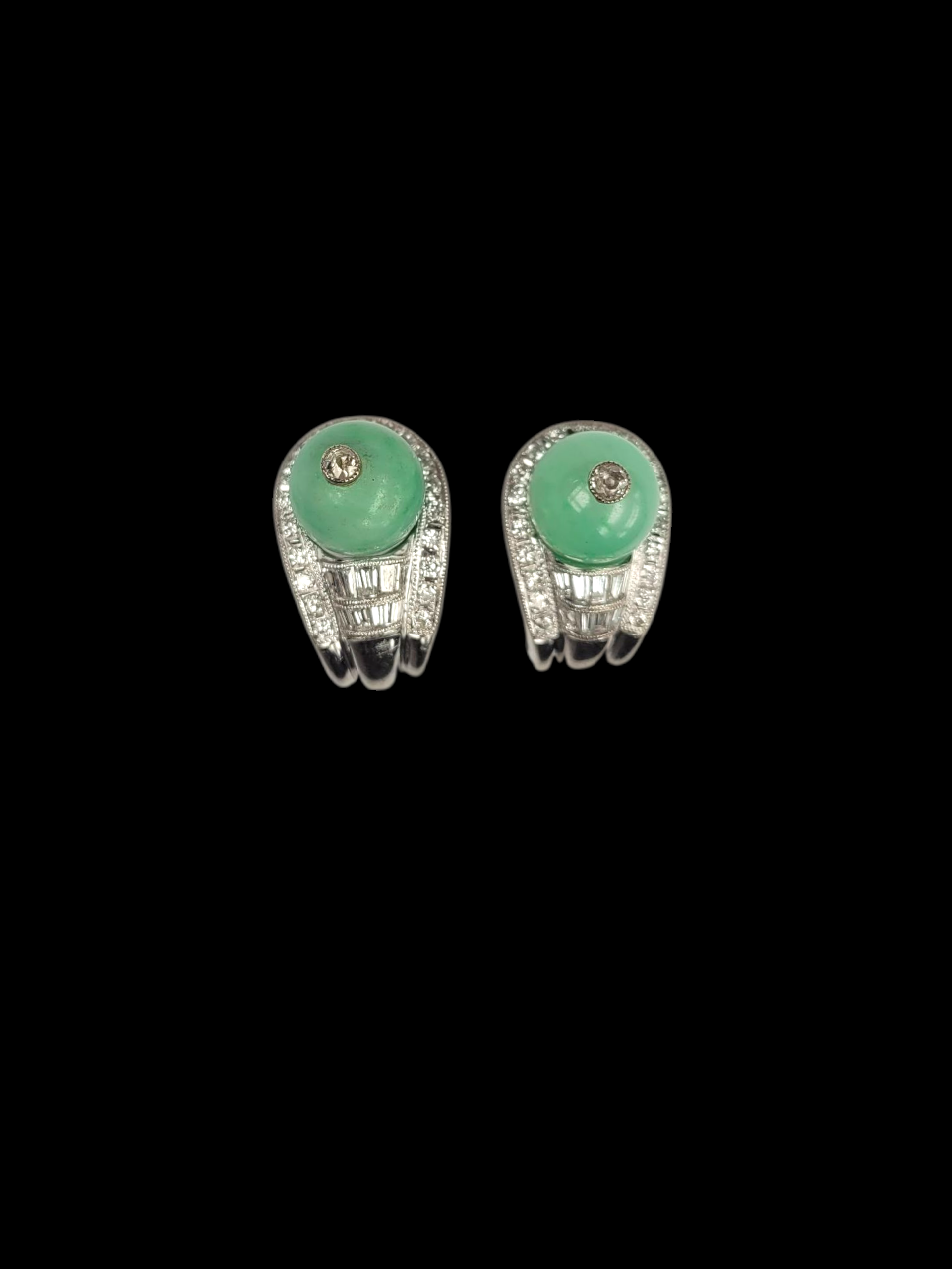 9mm jade bead old mine cut diamond to centre set in 18ct white gold stylish mount with baguette and brilliant cut diamonds. 1ct total. 20mm x 12mm. Peg and clip fittings)American circa 1970.