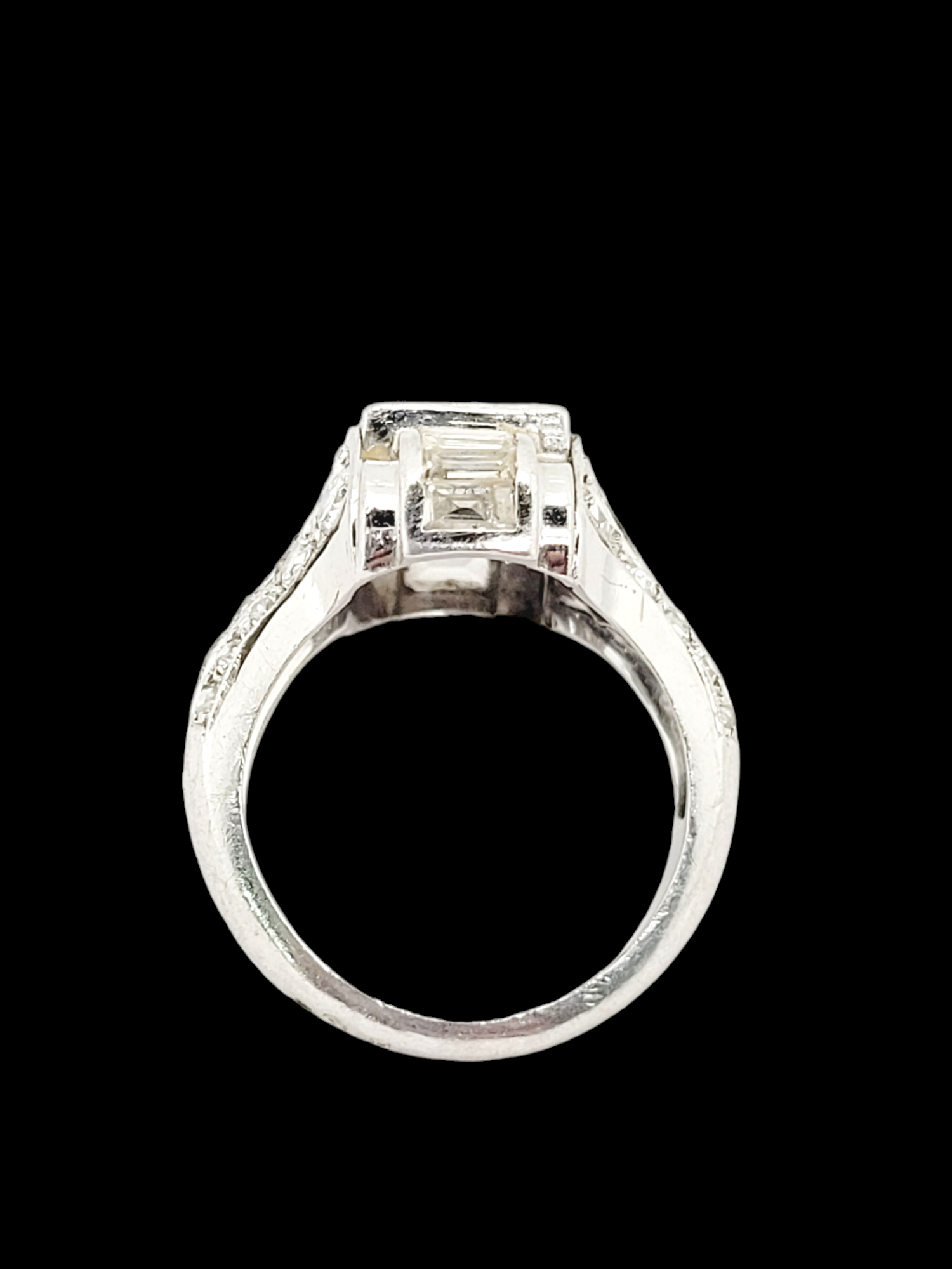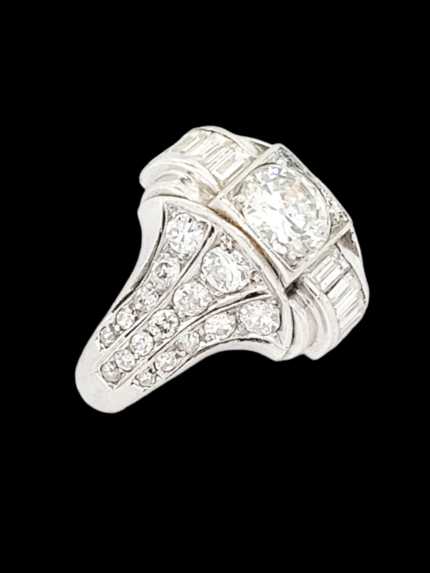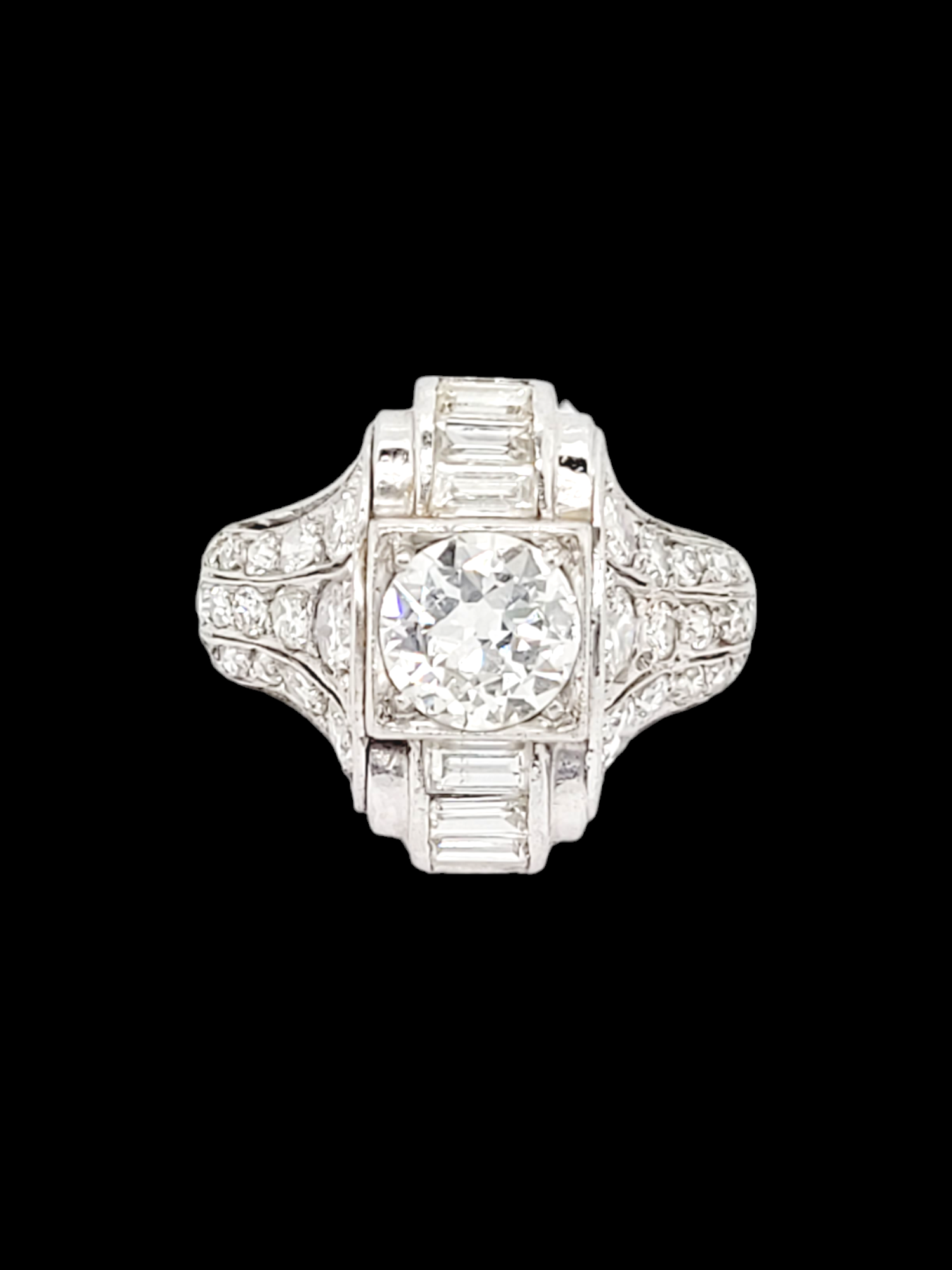So stylish and chic art deco diamond ring principle diamond is 1ct old European transitional cut with baguette diamonds landscape curved on gallery (1ct), three rows of graduating old European transitional cut to shoulders. (0.84cts)Head size 16.5mm. Total diamond weight c.2.84ct. All set in platinum. French investigating maker's mark. Currently finger size I 1/2