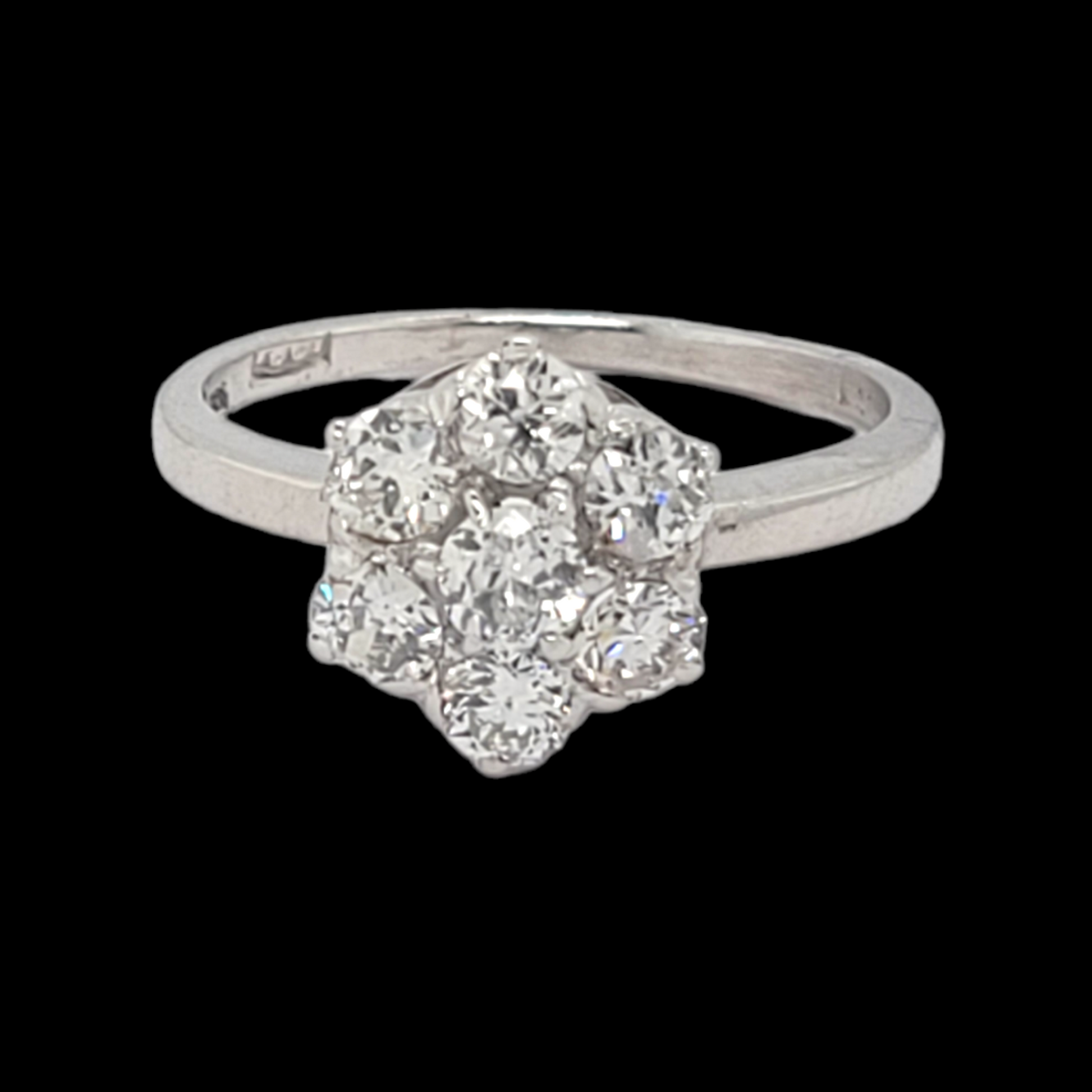1.15ct of old European transitional cut diamonds all set in 18ct white gold. Head size 11mm. English circa 1930