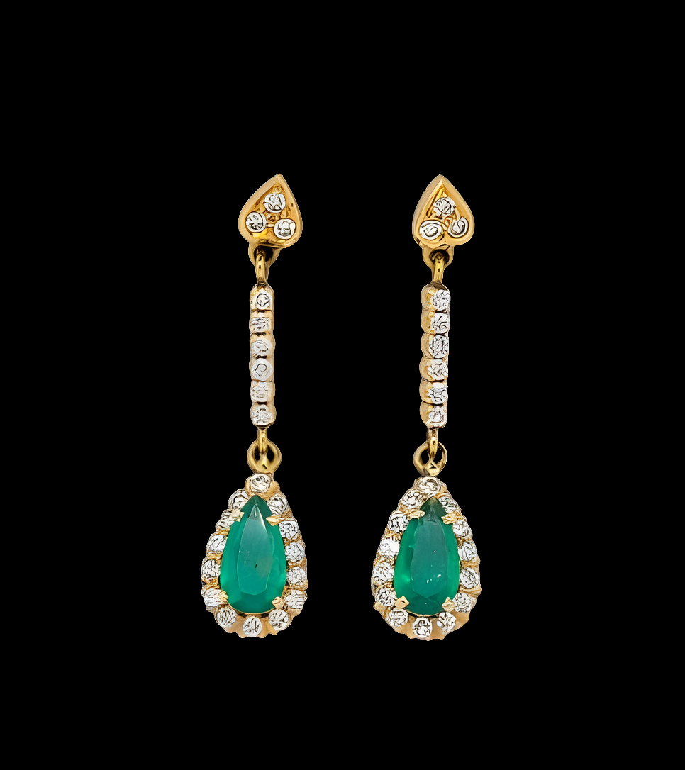 9.5mm x 5mm pear shaped emerald surrounded by brilliant cut diamonds suspended by a diamond set bar and inverted heart shaped stud. All set in 18ct yellow gold. 40mm long. 0.50cts of diamonds 1ct of emeralds. English circa 1960
