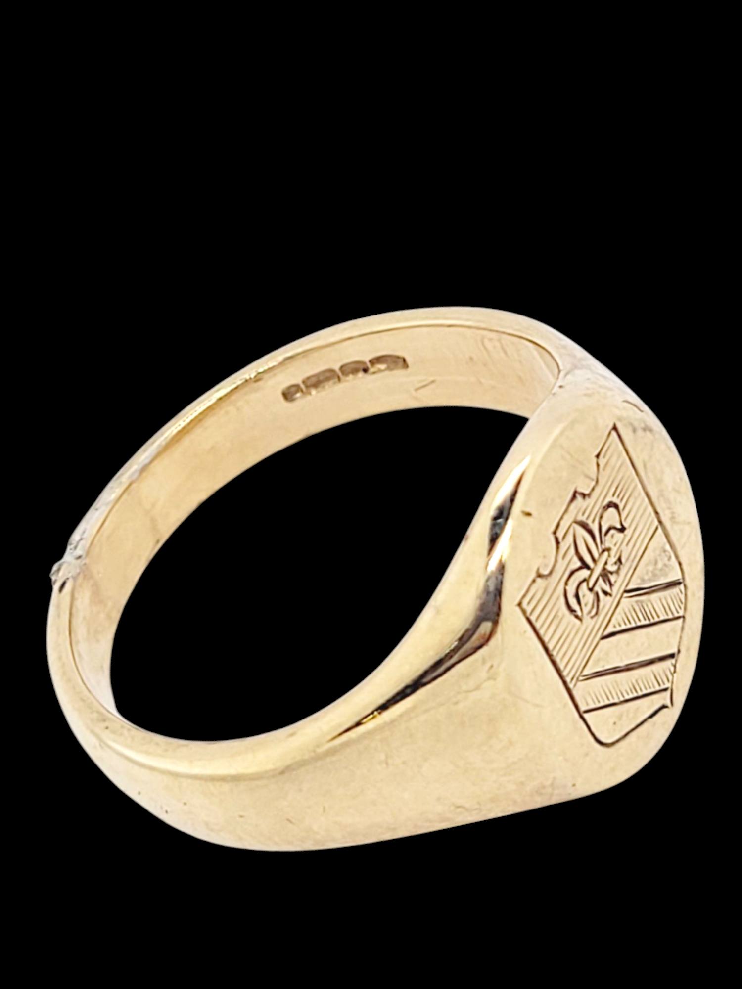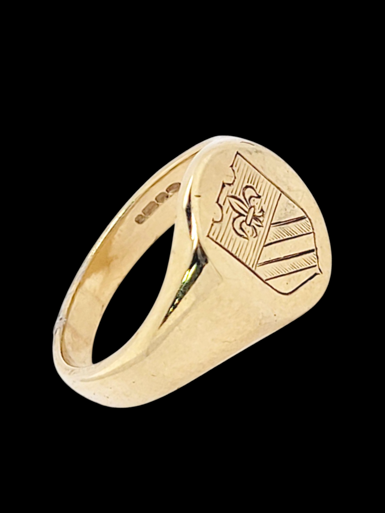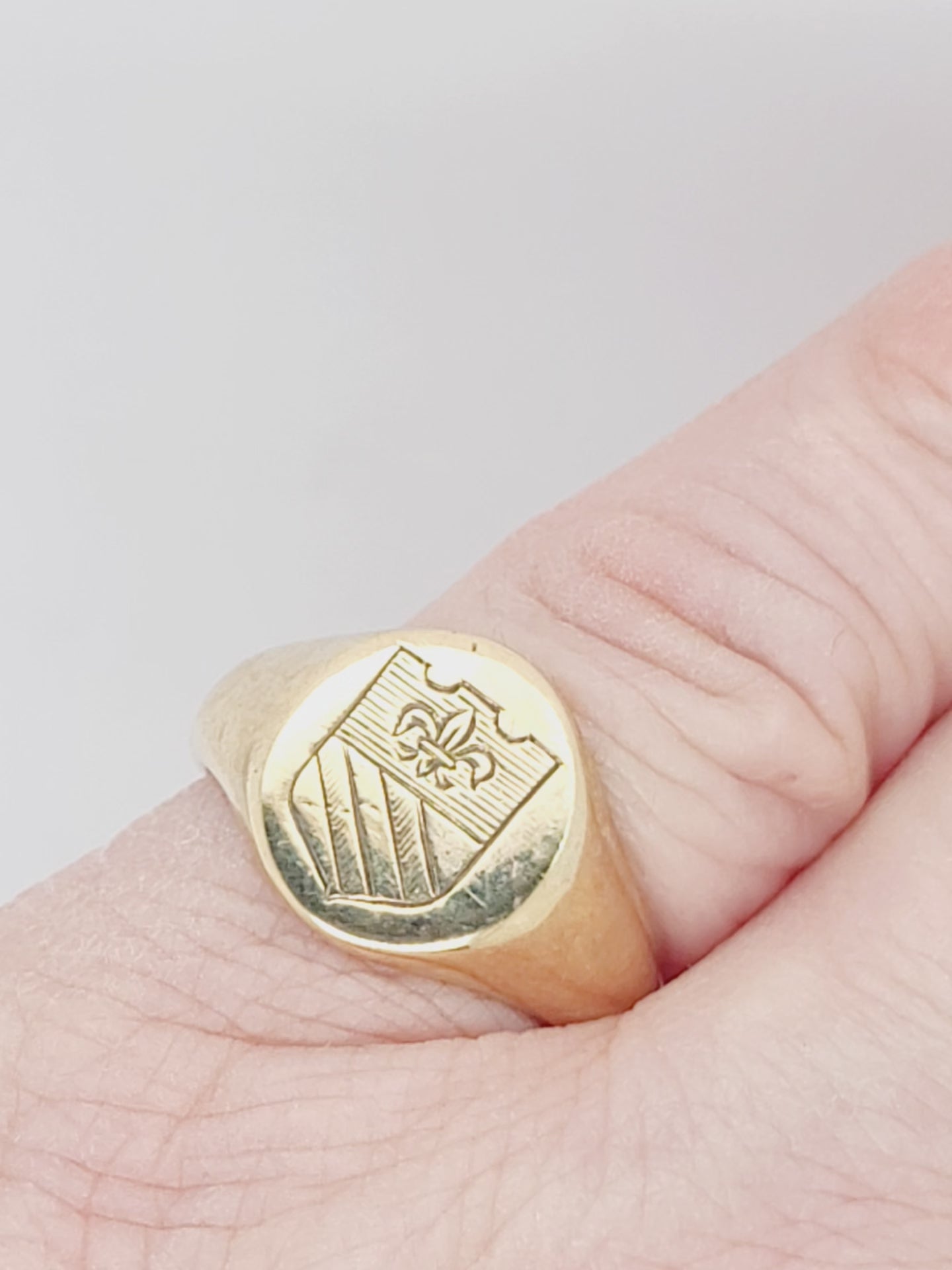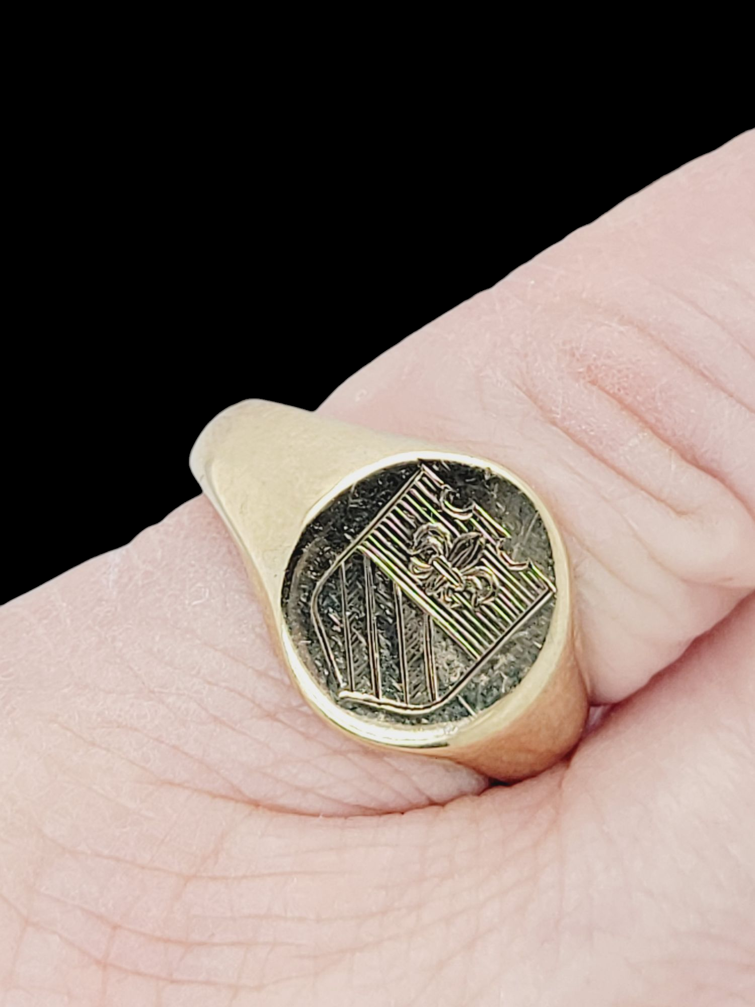 Oval signet ring 13.5mm x 13mm engraved to show with a shield, a chevron bottom half with a fleur-de-lis motif top. Currently finger size R 1/2 (U.S 9)