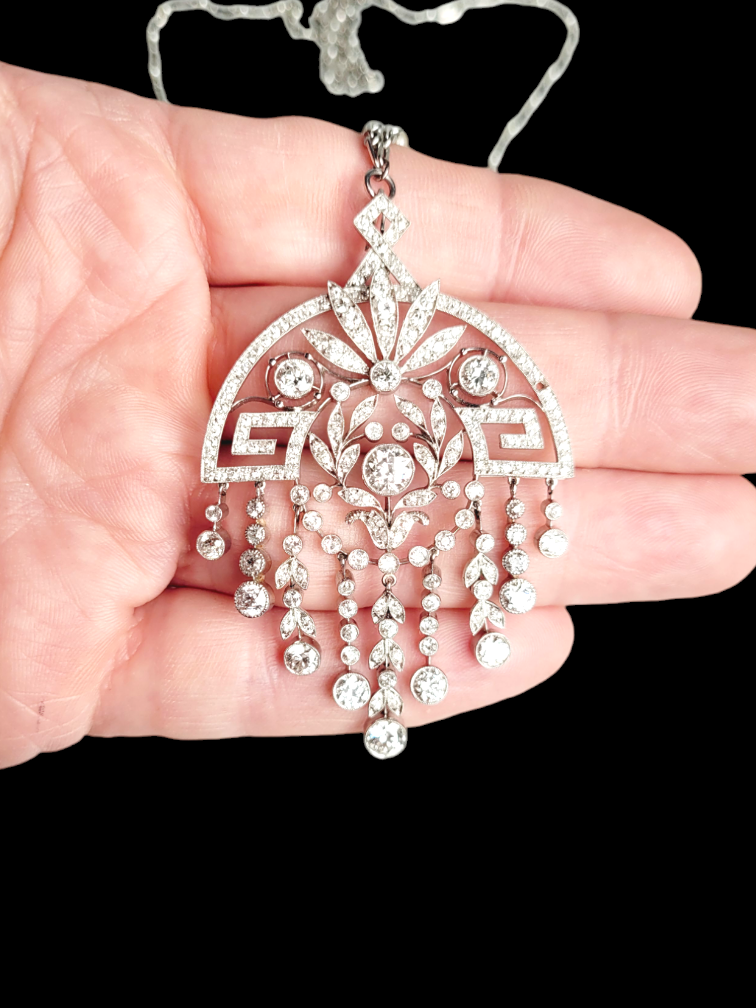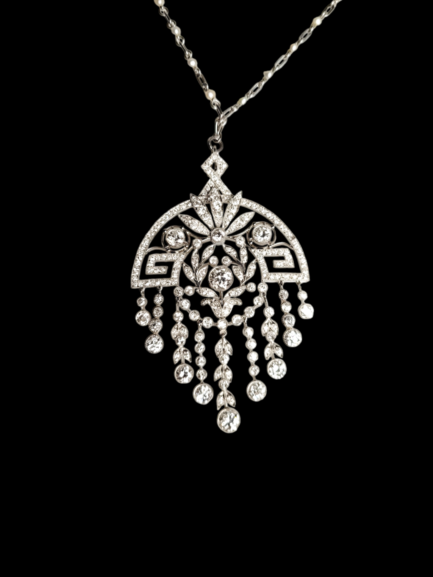 Quality art deco diamond fringe pendant with a floral Centre encased in a dome and Greek key with nine graduating articulated drops all set in platinum. (5cts) 7cms x 4.5cms. Diamond set geometric bale with a long natural pearl and platinum chain. 32 inches long (81cms) circa 1920