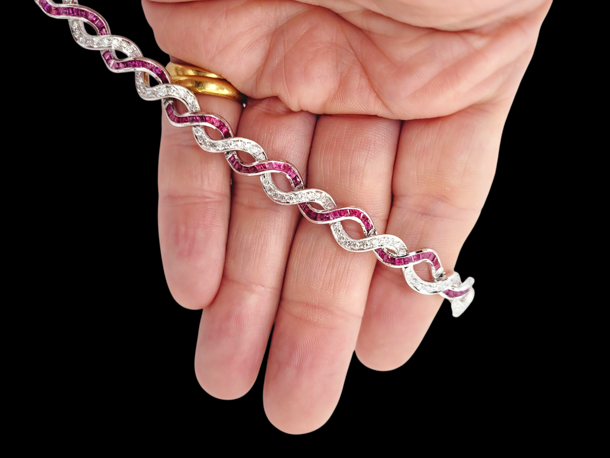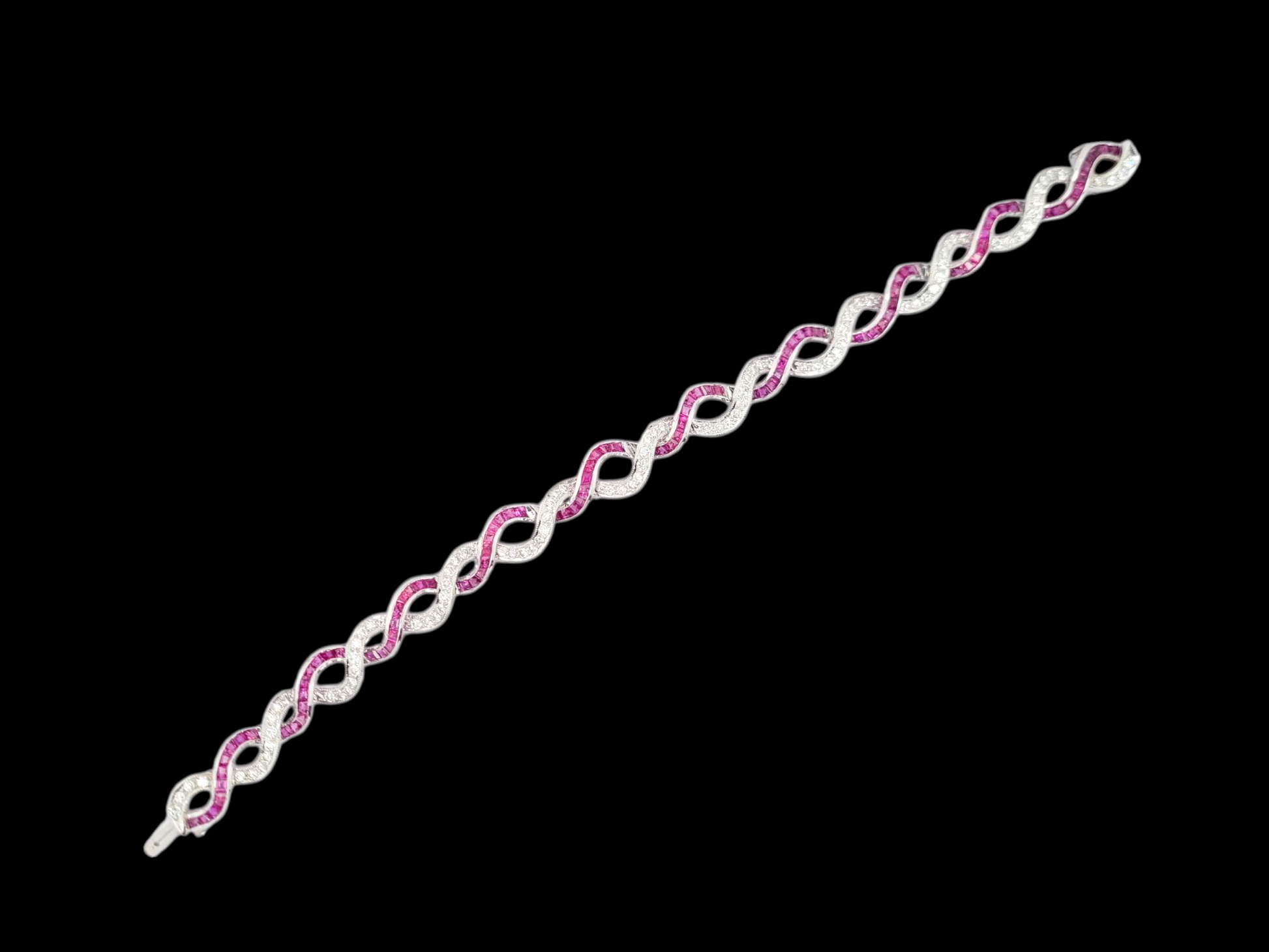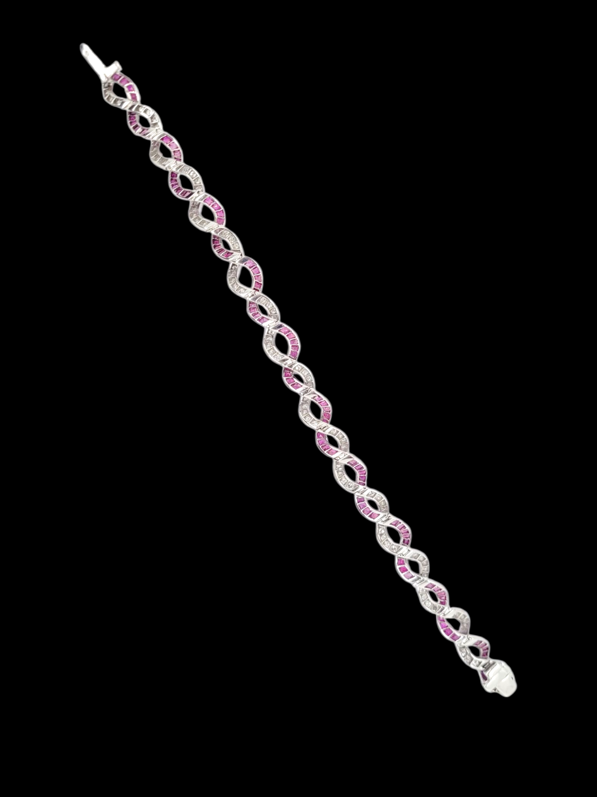 Fine calibre ruby and diamond entwined bracelet. 3cts of individual shaped paved rubies and 3cts of round brilliant cut diamonds set in platinum. 8.5mm wide. 18.5cms long (7.5 inches)