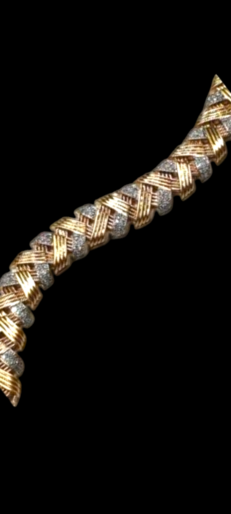 Articulated ribbed gold link bracelet with two row diamond sections (1.70ct) set in 18ct gold and platinum. 16mm wide 6.75 inches long.