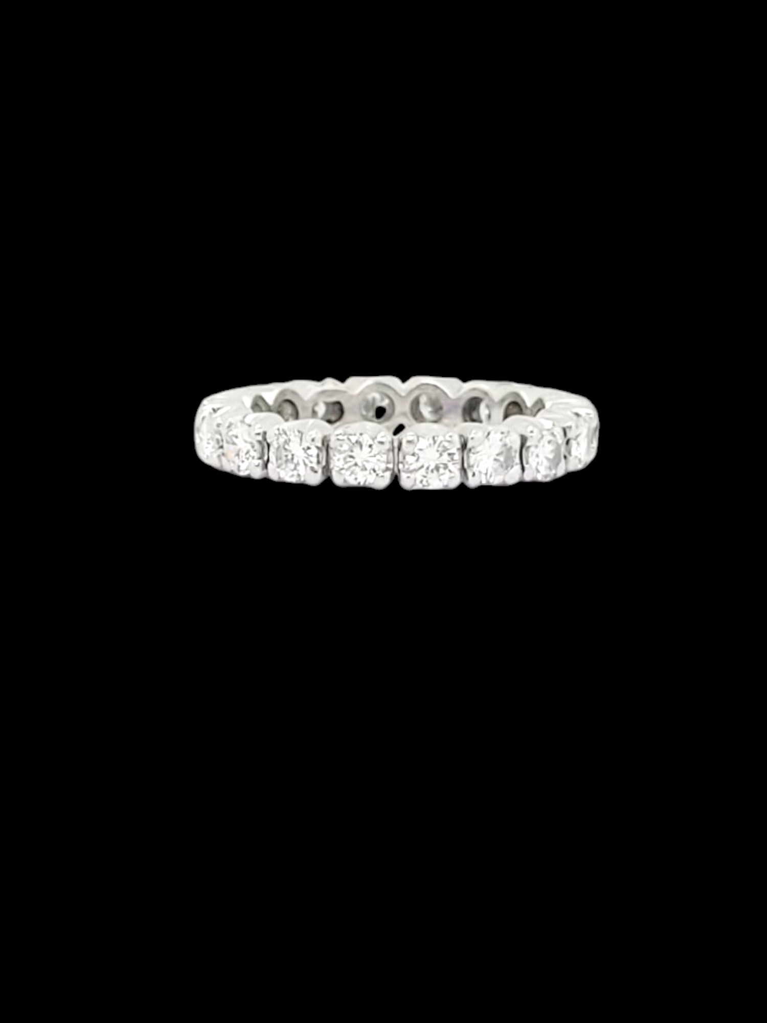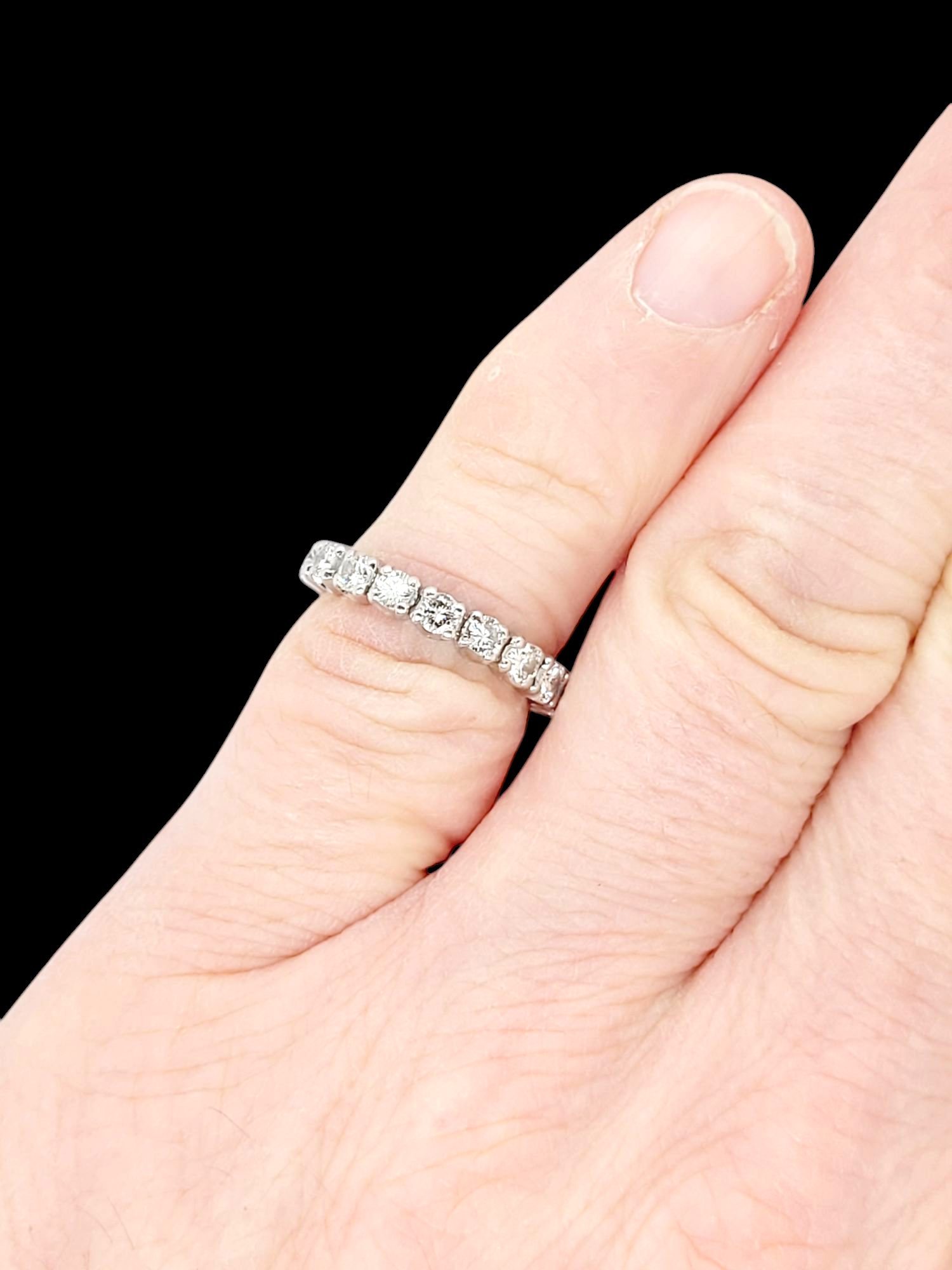 0.90cts of brilliant cut diamonds claw set in platinum. 3mm wide. Finger size J (U.S 5)