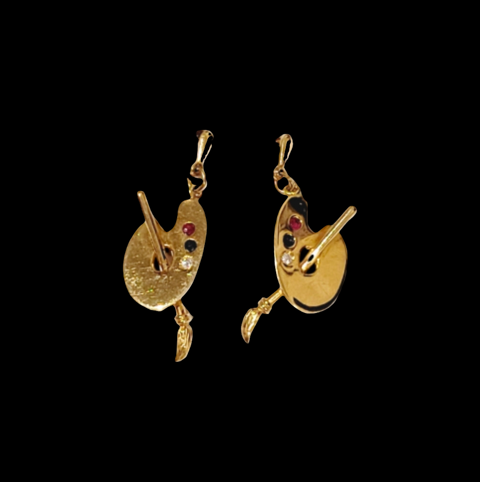 18ct yellow gold drop pendant earrings with a paint pallet and paint brush with a ruby emerald and diamond. 35mm x 11mm. English circa 1960