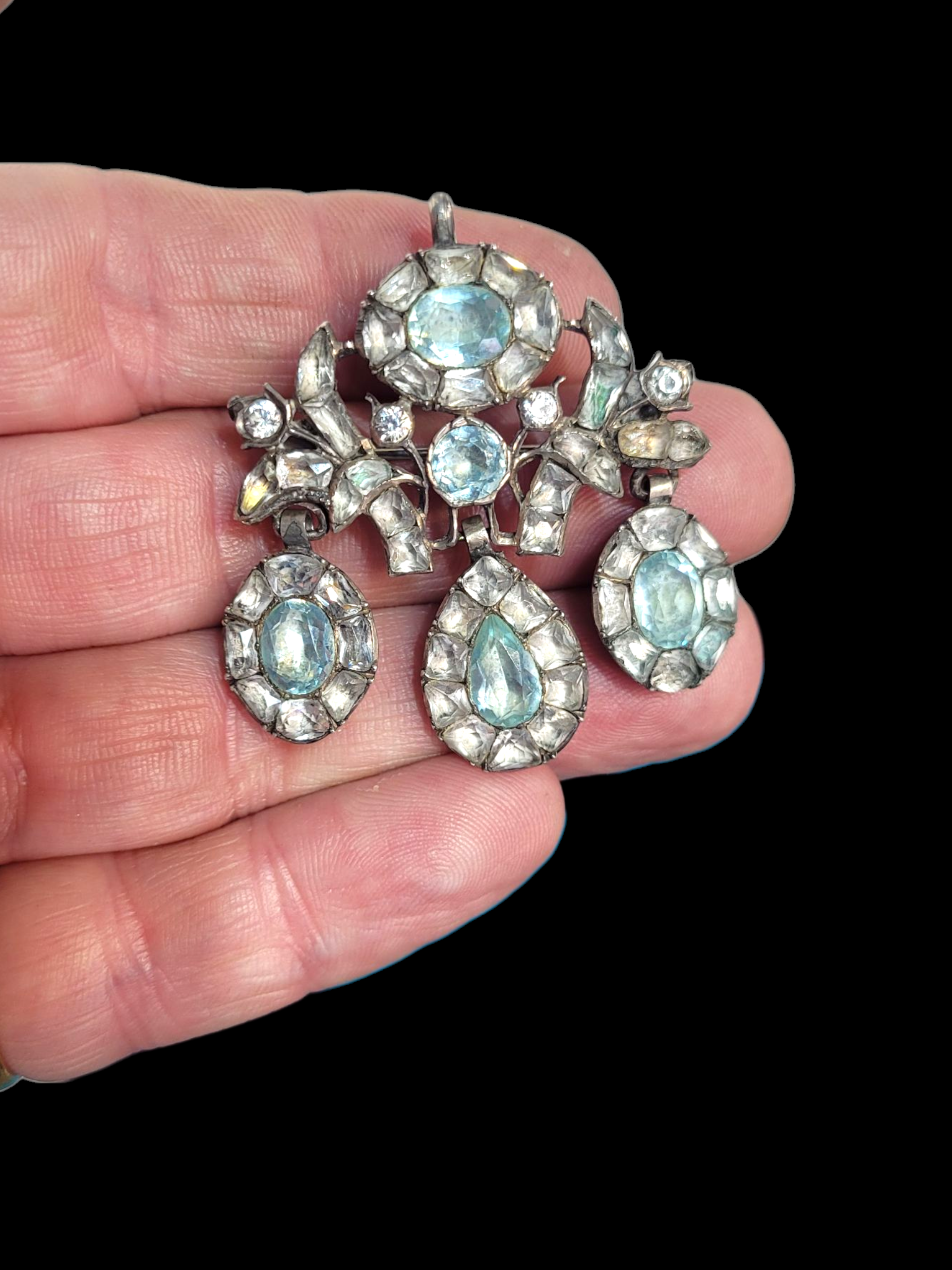 Portuguese girandole with aquamarine paste centres surrounded by cushion cut white pastes. Originally an earring now with pendant and brooch fittings. Circa 1760. 45mm diameter.
