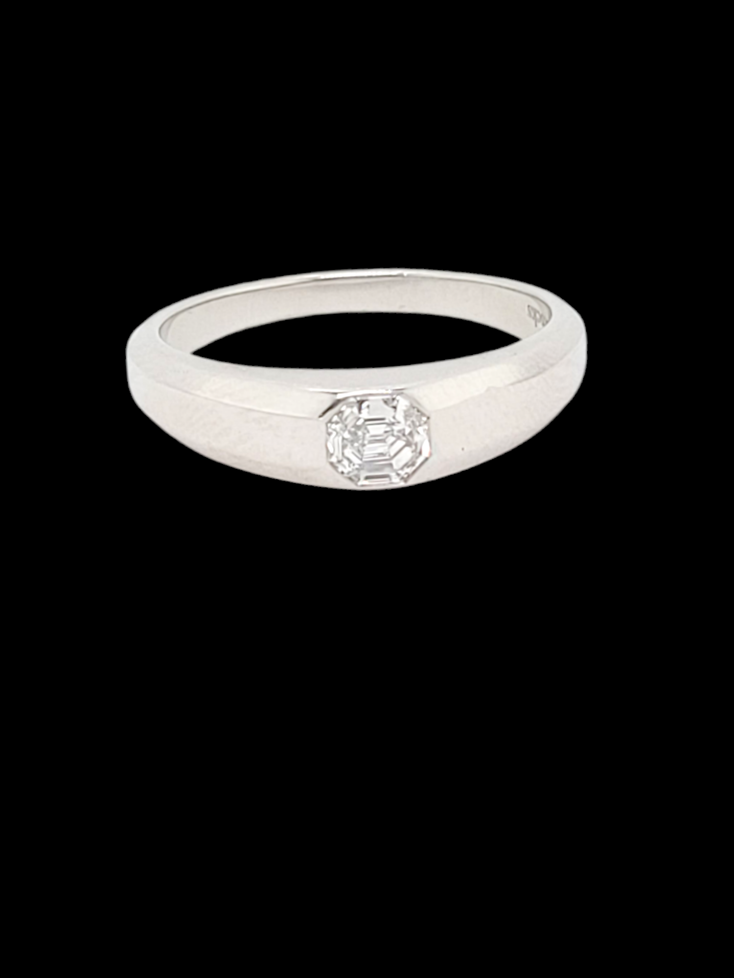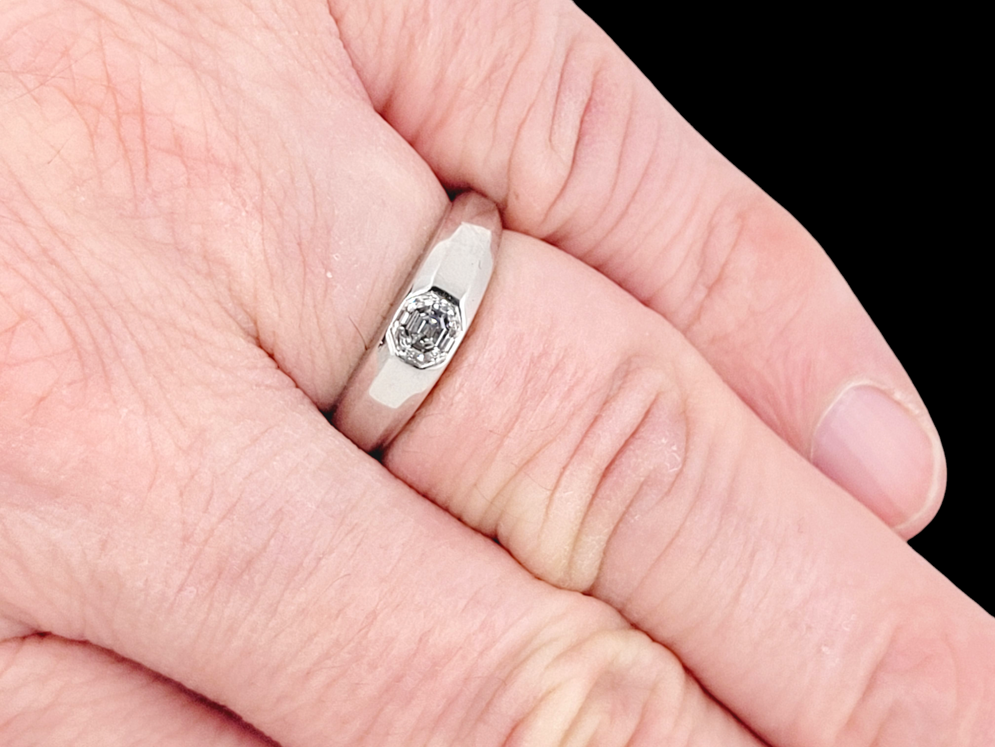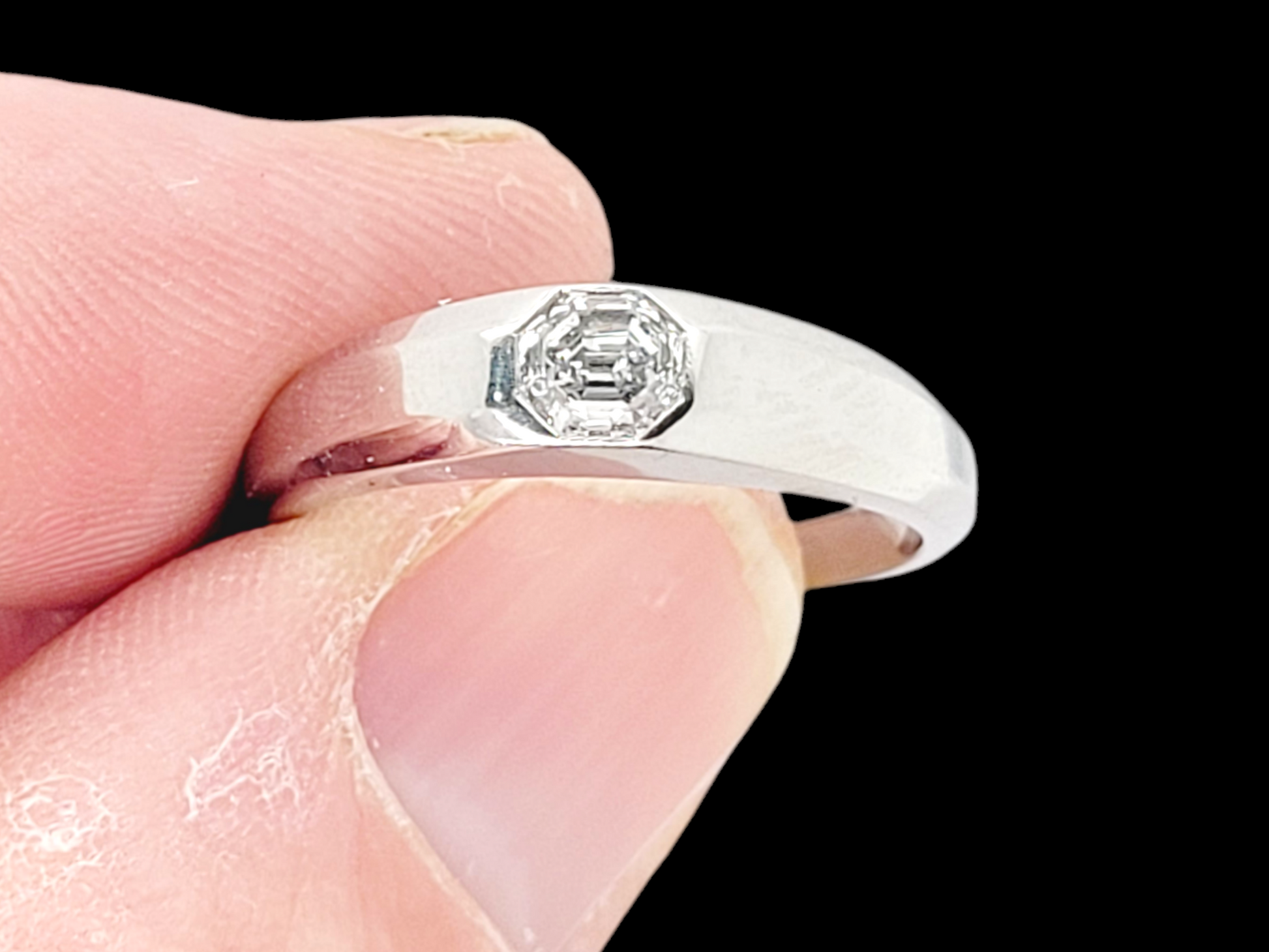 Designer Landscape 0.51ct G.I.A certified G Vs2 Octagonal step cut diamond gypsy set in faceted platinum ring. 5.3mm wide. Currently finger size Q 1/2 (U.S 8.5)