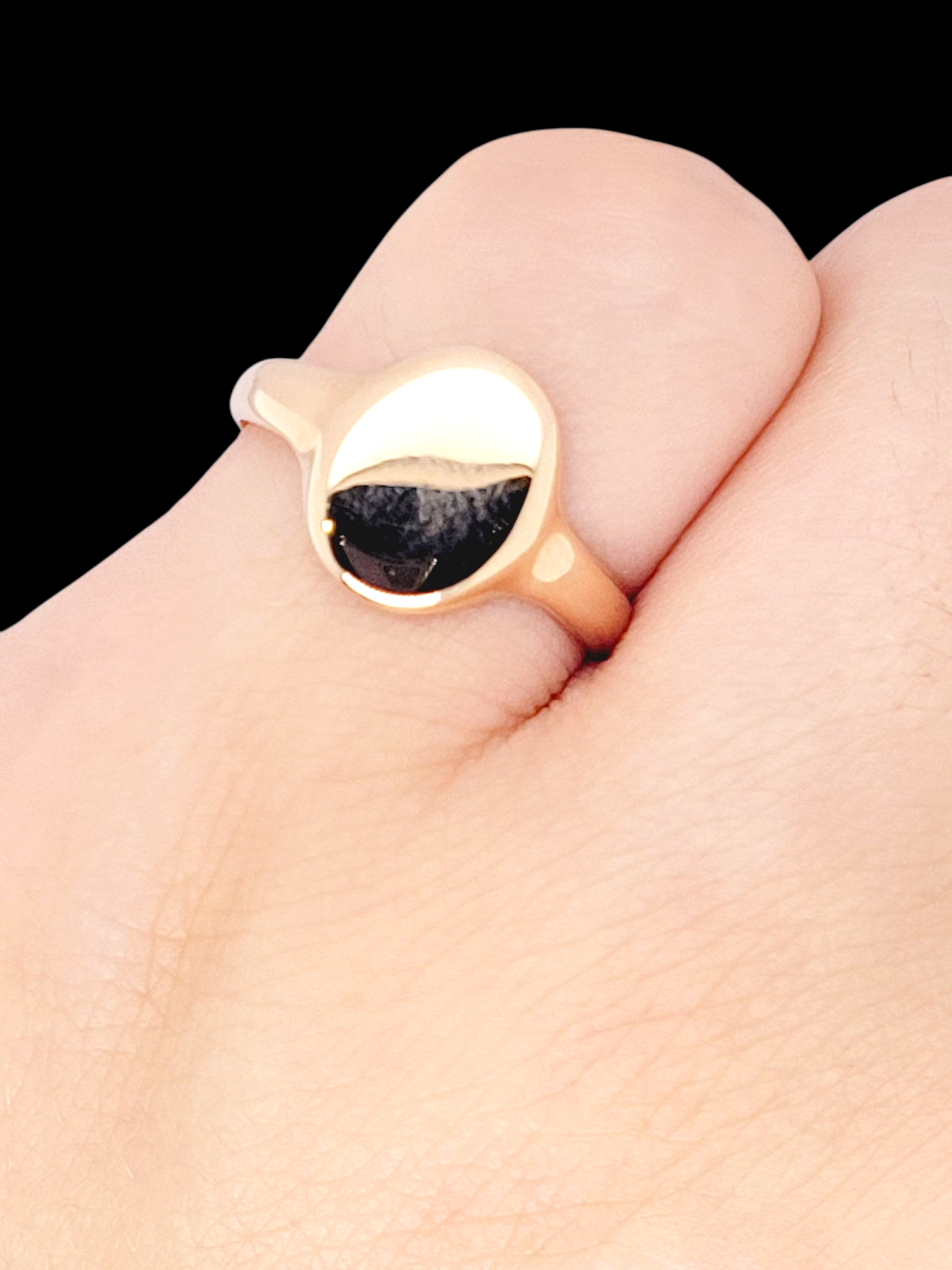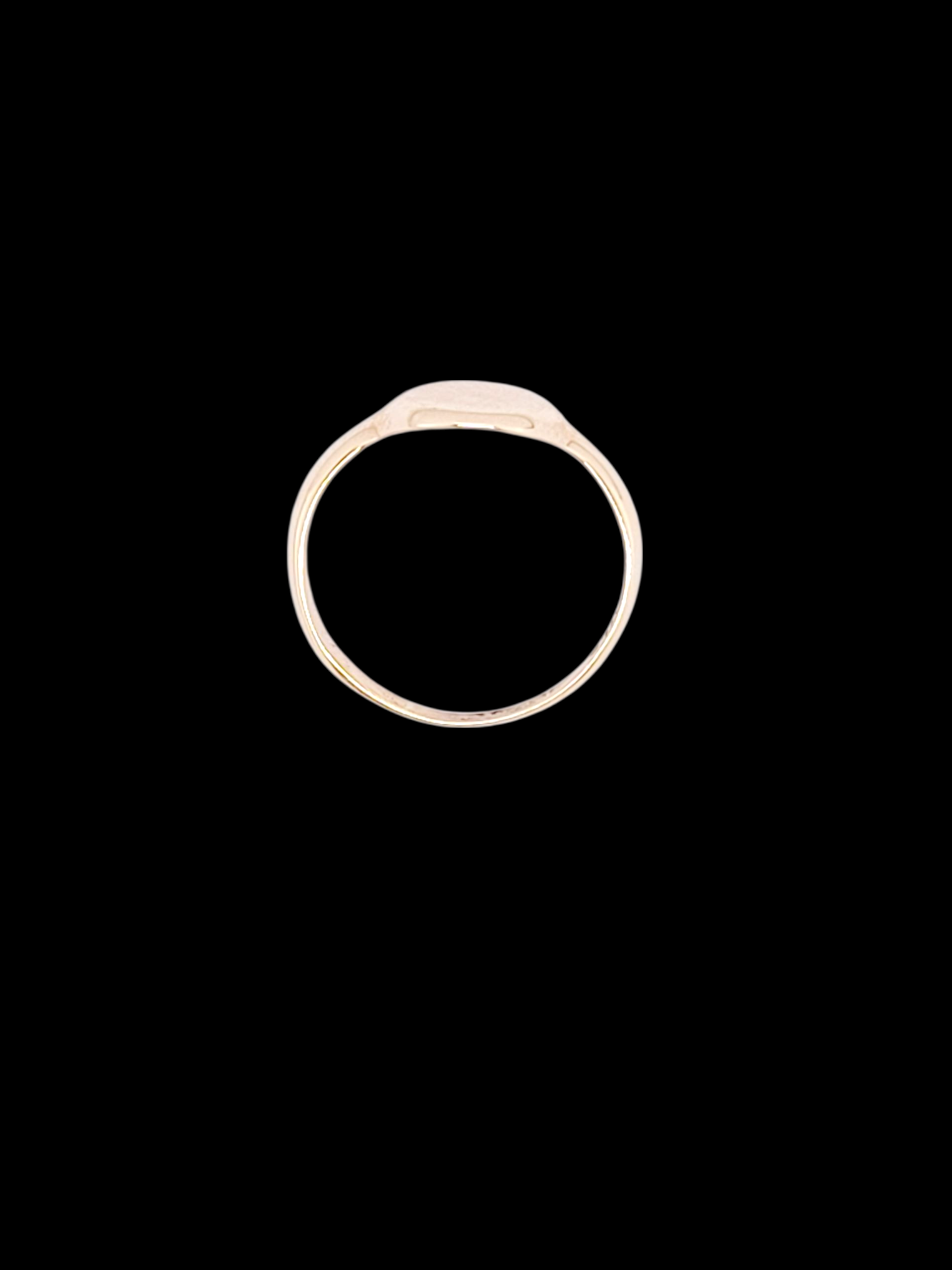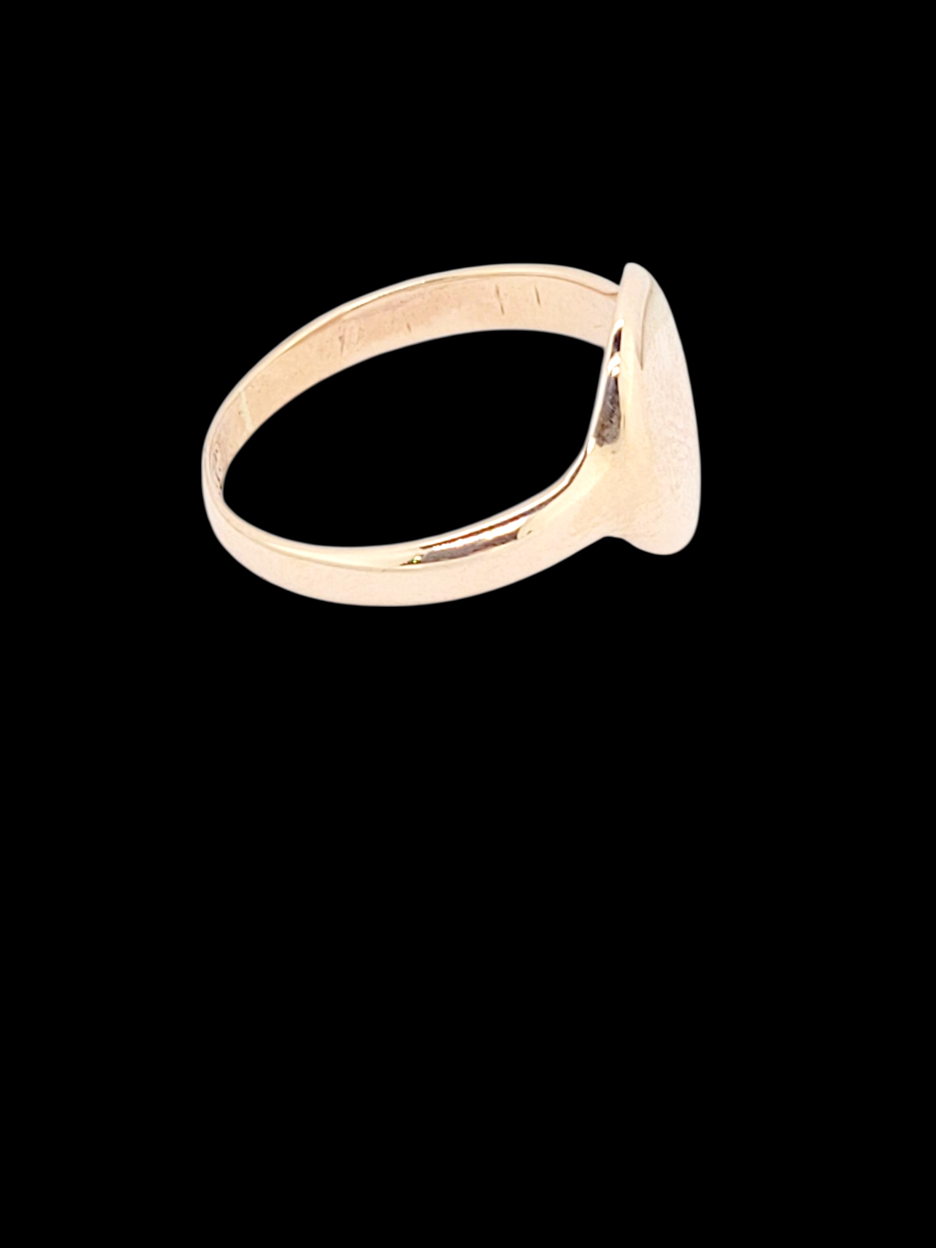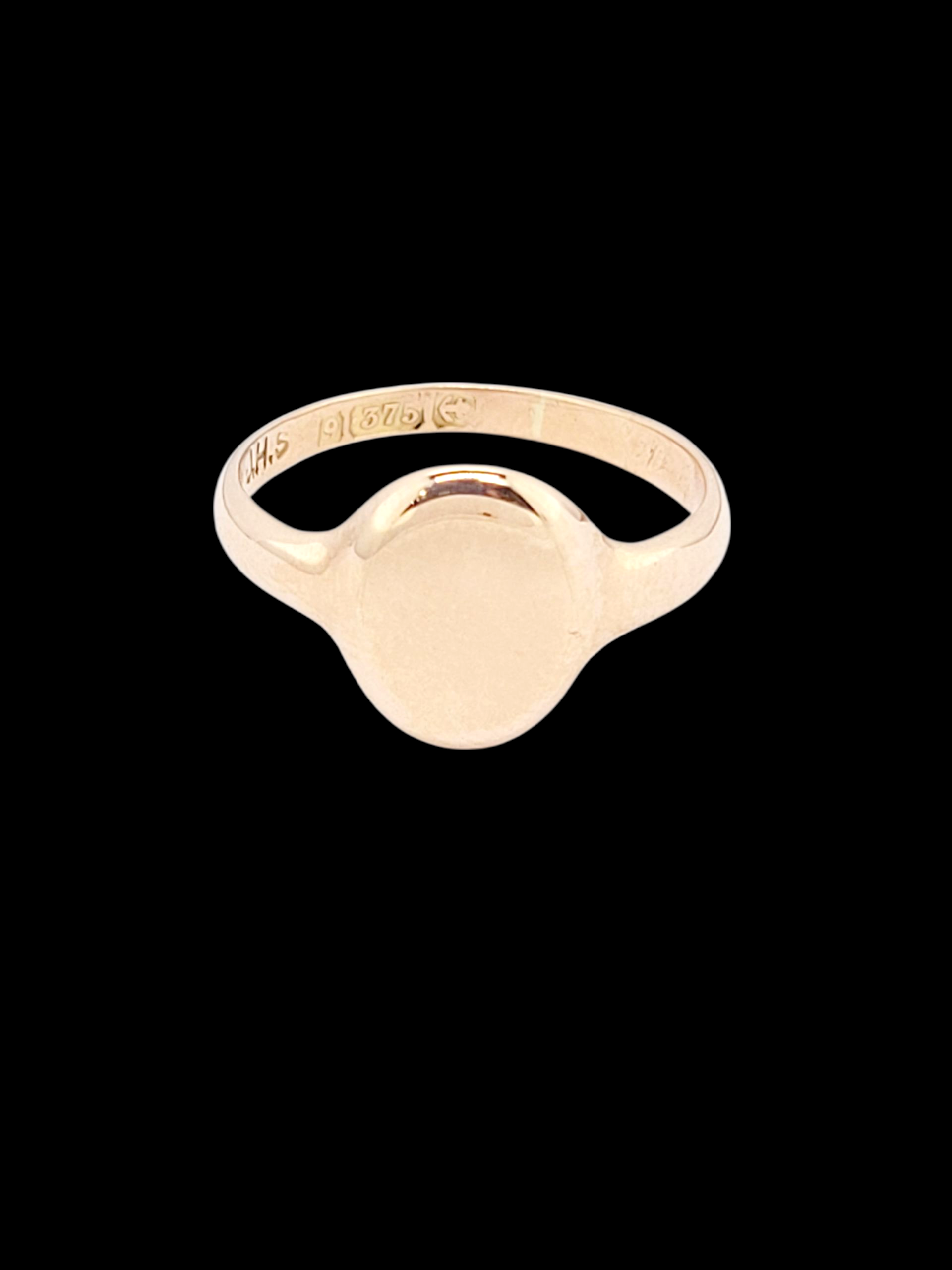 Petite rose gold signet ring 10.5mm x 9.5mm oval head. Hallmarked 9ct gold Birmingham, maker's mark J.H.S. circa 1930. Currently finger finger size J (U.S 4.75)