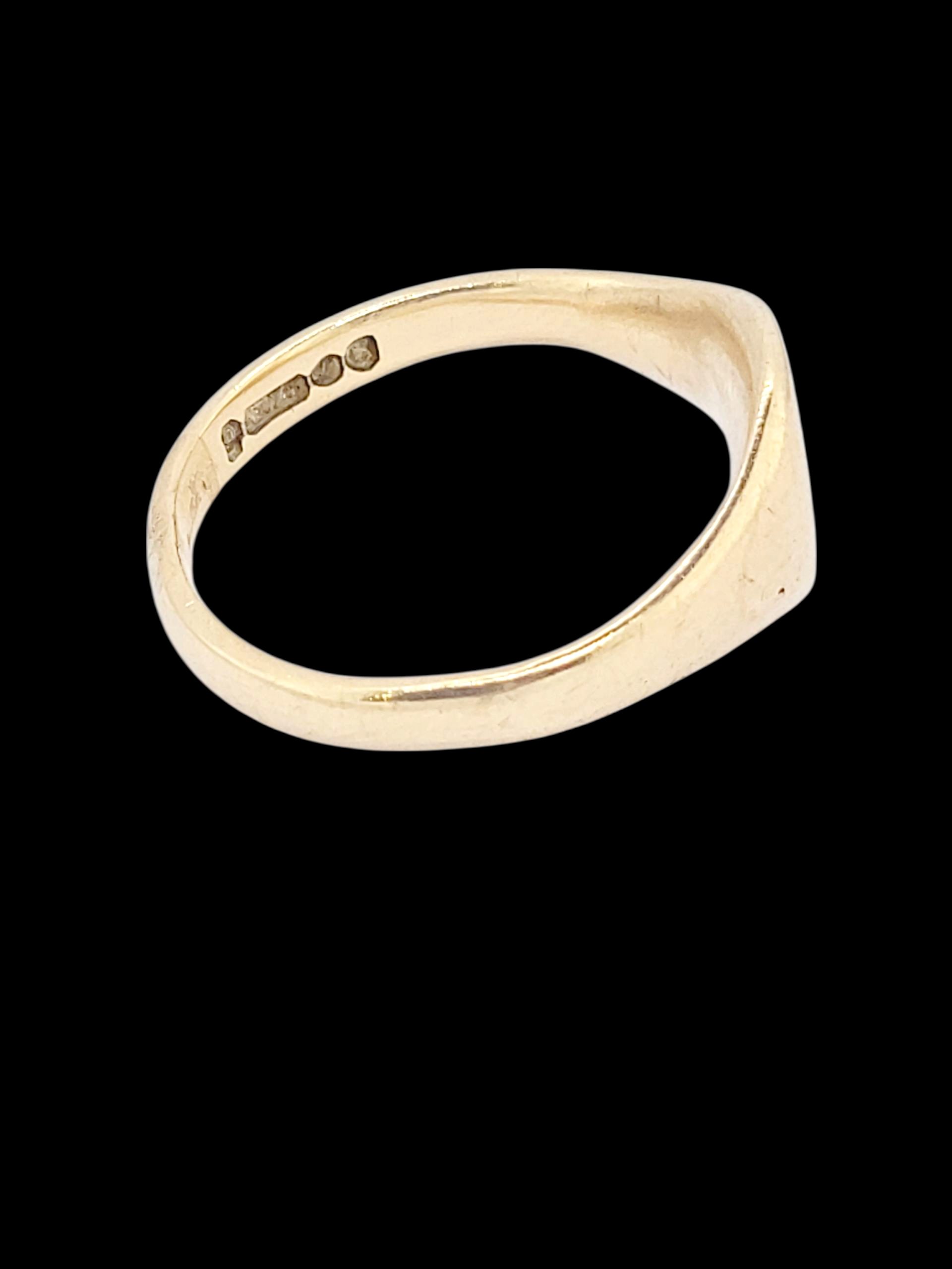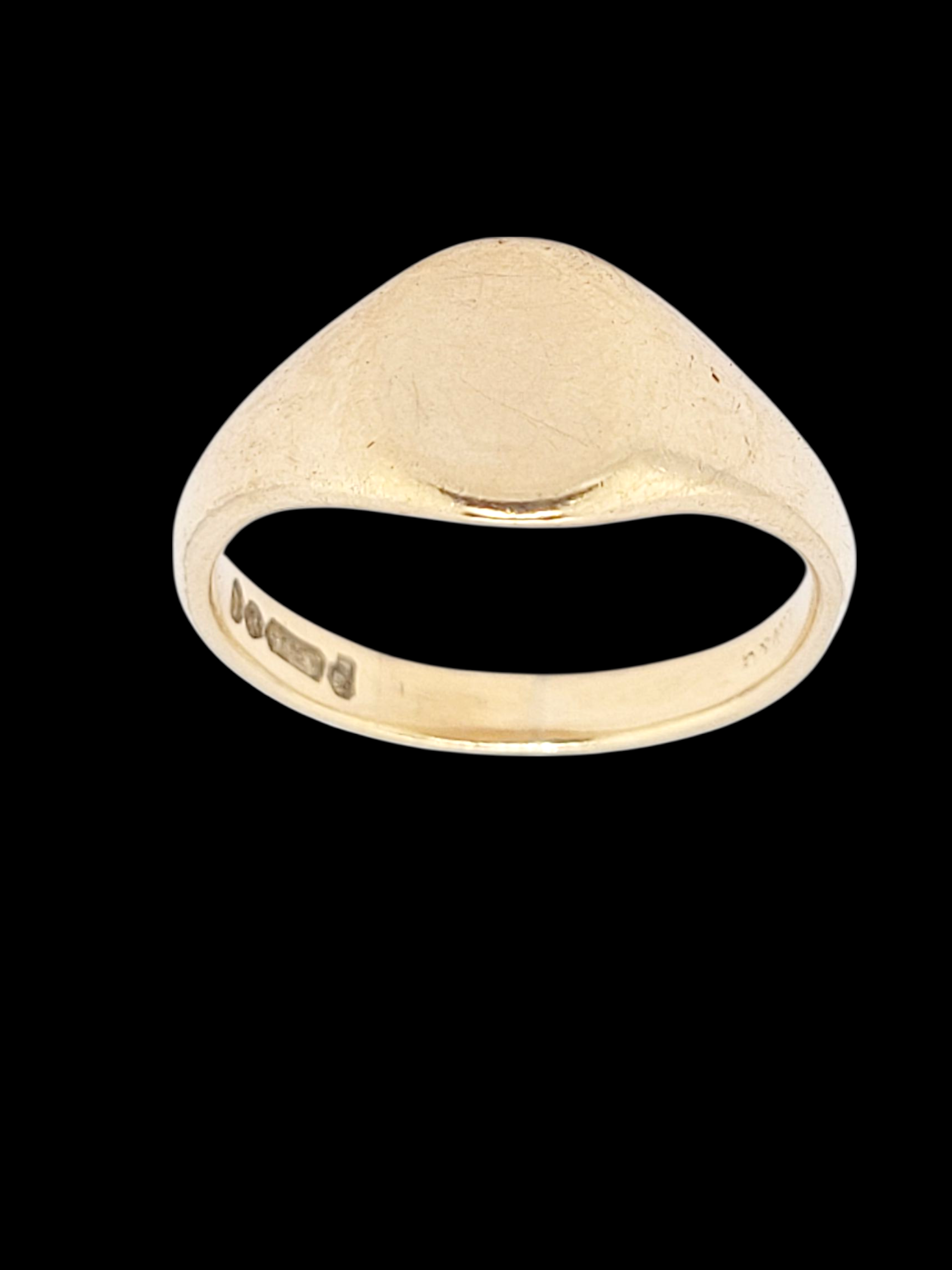 Difficult to find, 10mm x 9mm oval yellow gold signet ring. Hallmarked 1961 9ct gold. Maker's mark Lawson, Ward & Gammage. 4.5 grams. Currently finger size P (U.S 7.75) can easily be sized.