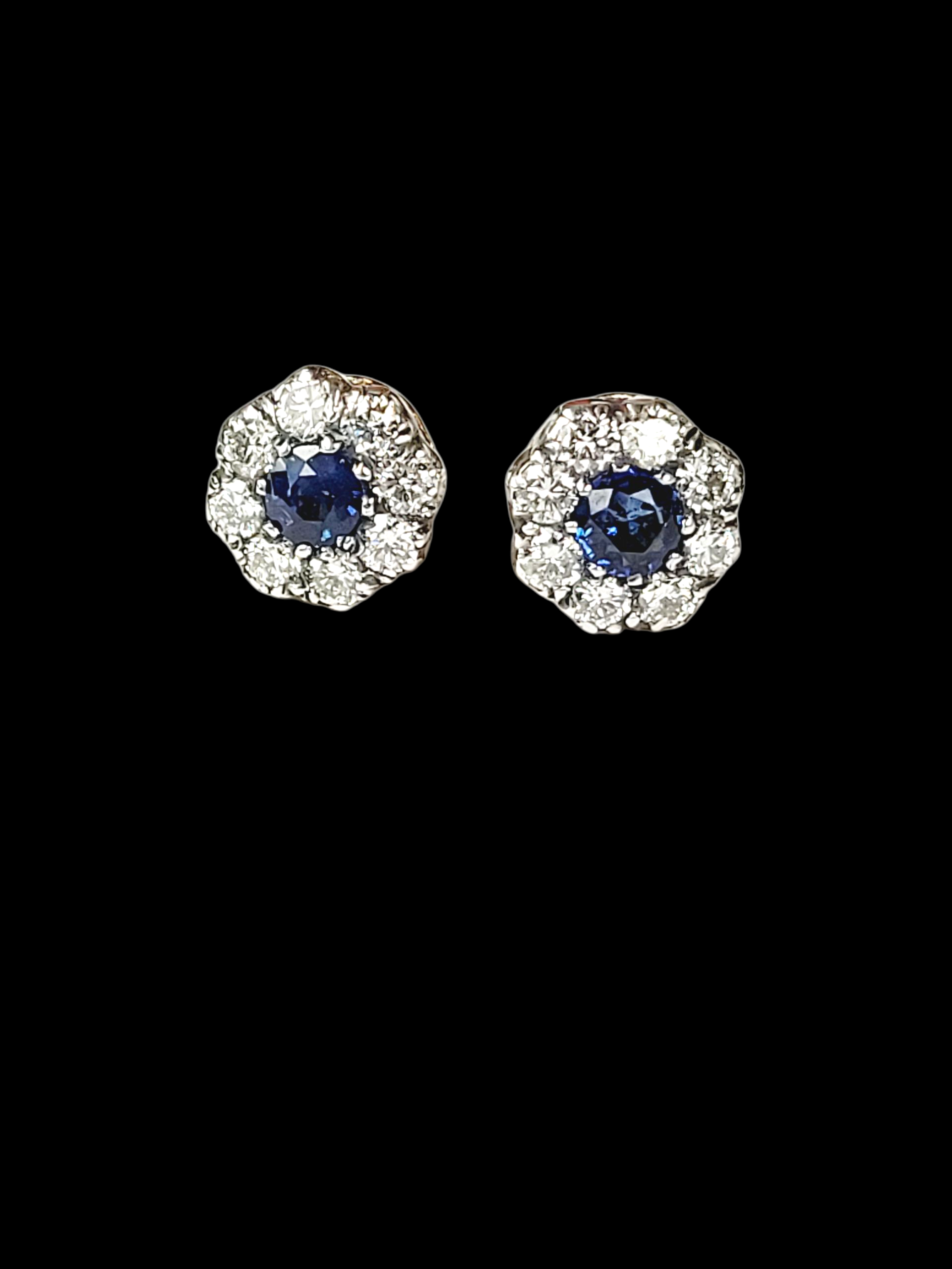 Royal blue round sapphires surrounded by brilliant cut diamonds set in 18ct white gold and 18ct yellow gold backs. 0.40cts sapphires 0.50cts diamonds. Diameter 9mm.