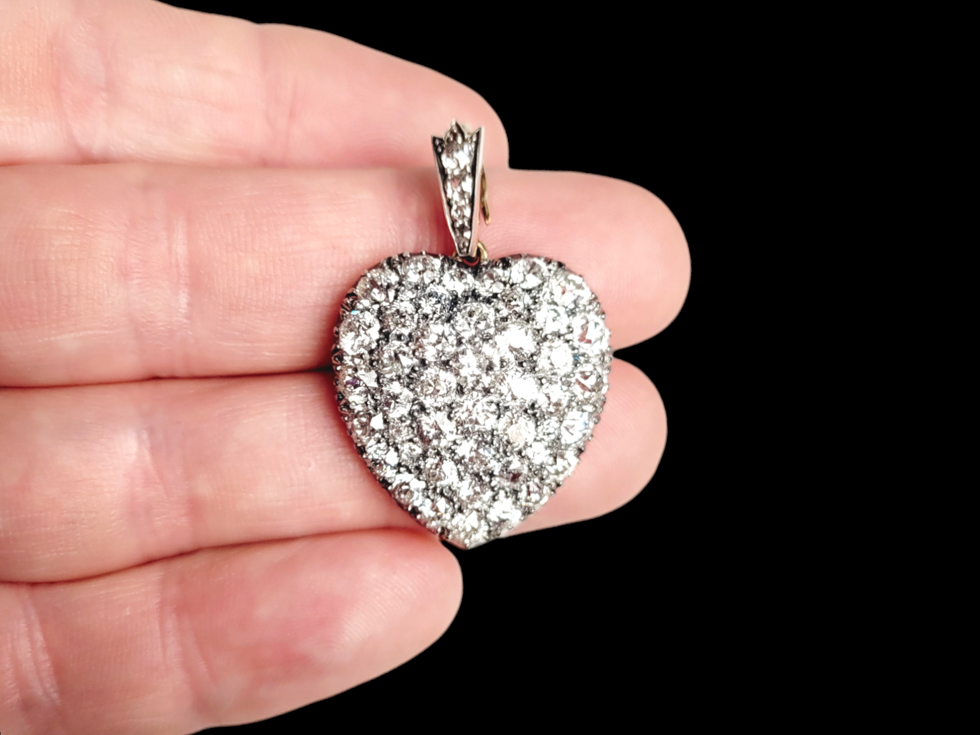 7cts of old mine cut diamonds set in silver top and 18ct gold back. 28mm plus 11mm diamond set bale loop. English circa 1880
