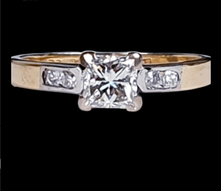Half a carat princess cut diamond set in a four claw mount with two diamonds to each shoulder all set in 18ct gold. Currently finger size J 1/2