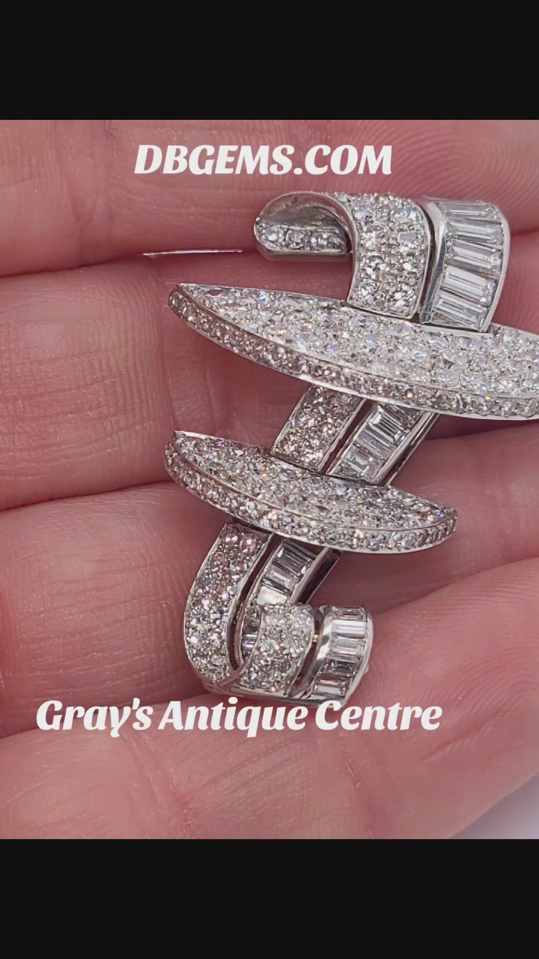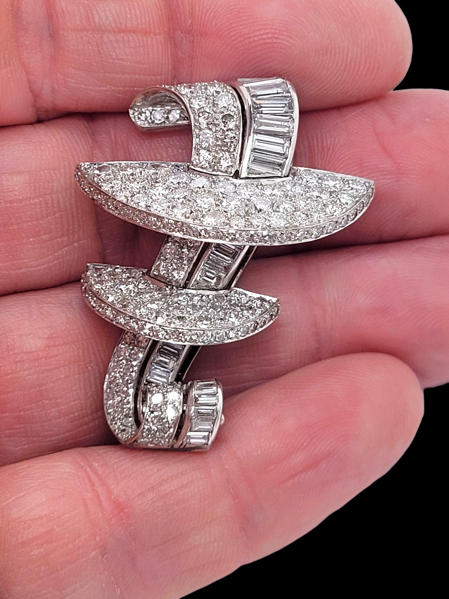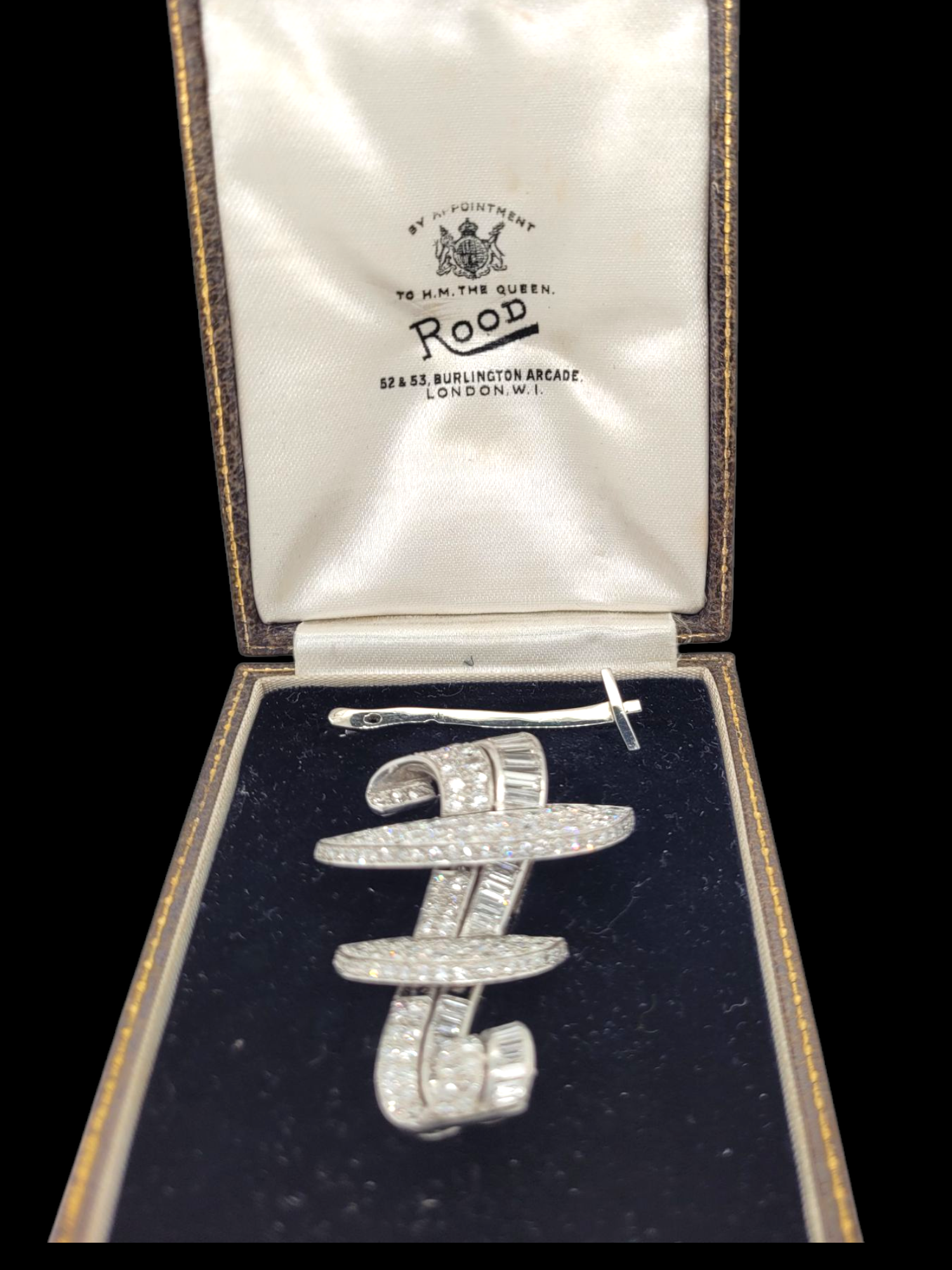 Art deco baguette diamond and pave diamond scroll intersections of graduating 3D pave diamond semi circles. Signed and retailed by Rood warrent holders to the Queen. 5cts set in platinum. 45mm x 35mm