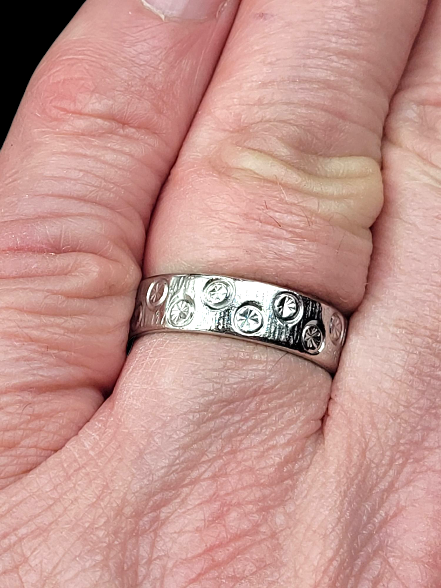 5.5mm flat edged 1979 vintage wedding band with textured engraving with off set circles with star centres. Hallmarked London 1979 platinum, maker's mark B&N. Currently finger size T (U.S 9.75)
