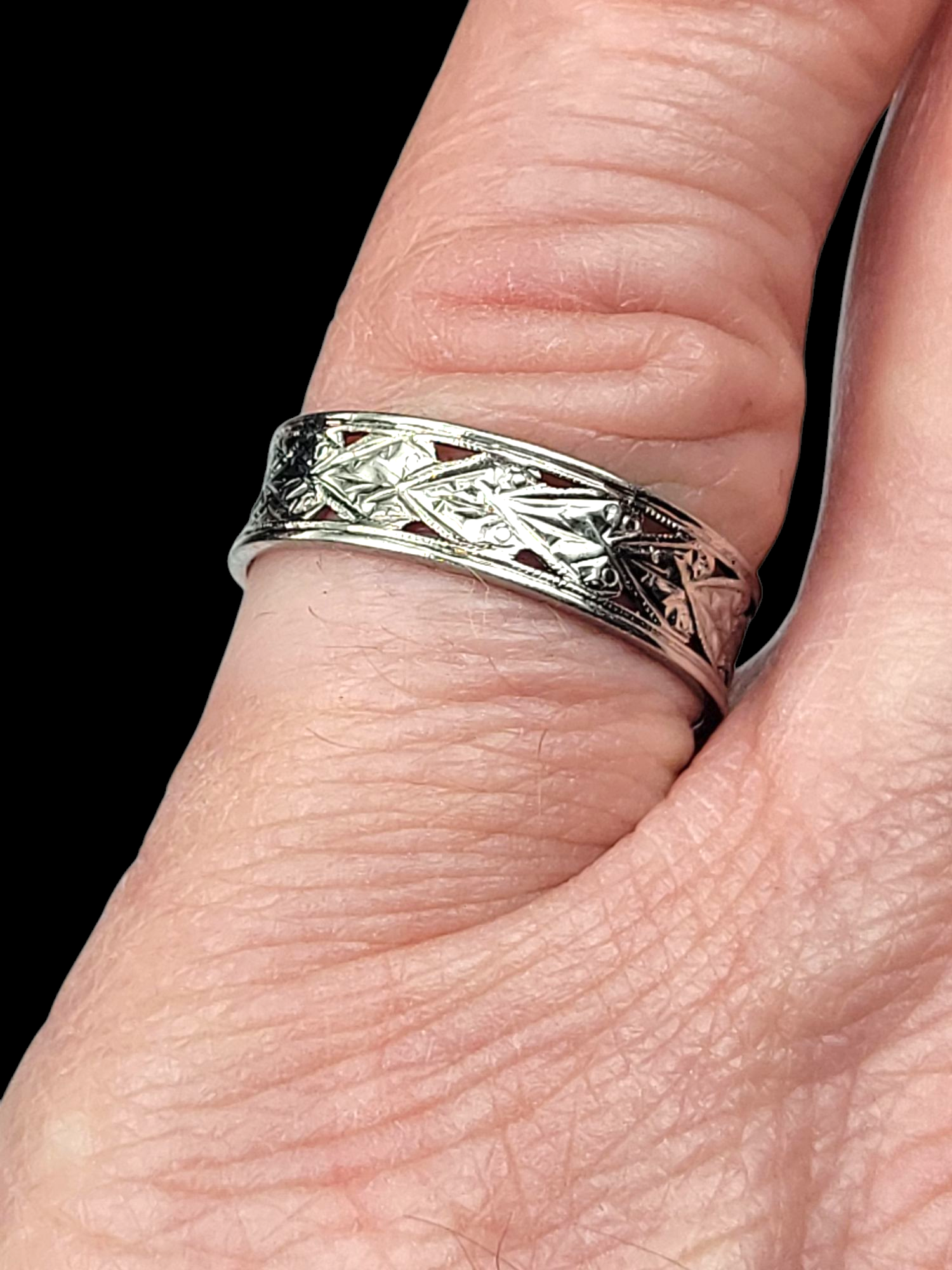 Unusual art deco wedding band 5.5mm wide with row of engraved leaves cut out and running around the band. Hallmarked plat. Maker's mark S&W. Currently finger size P 1/2 (U.S 8)