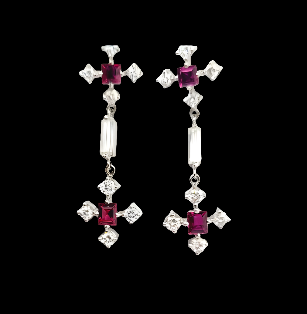 X marks the spot for treasure! Square rubies within a diamonds suspending a baguette diamond and a larger motif. 0.84cts of diamonds, rubies 0.30cts. 18ct white gold. 34mm x 12.5mm.