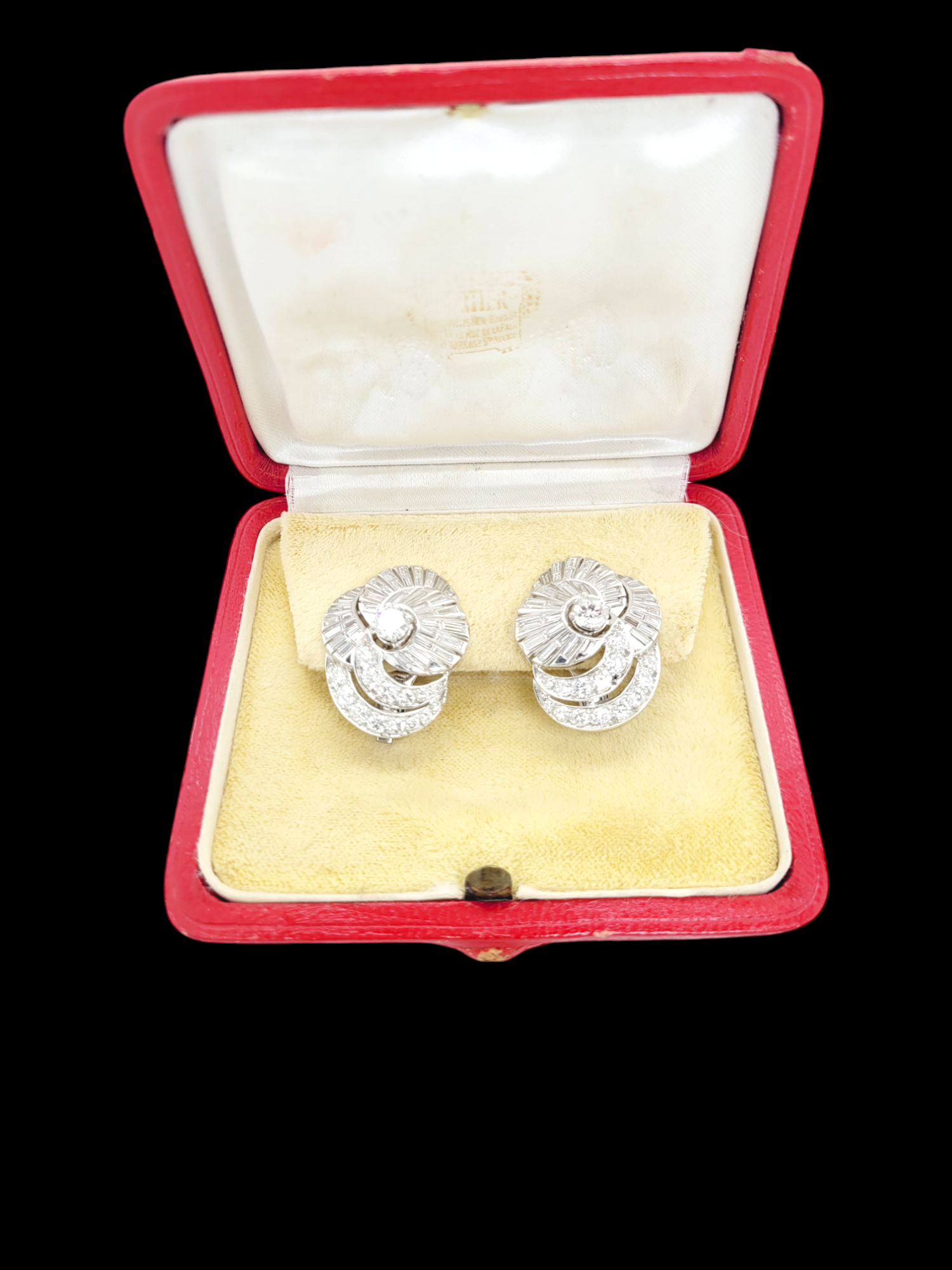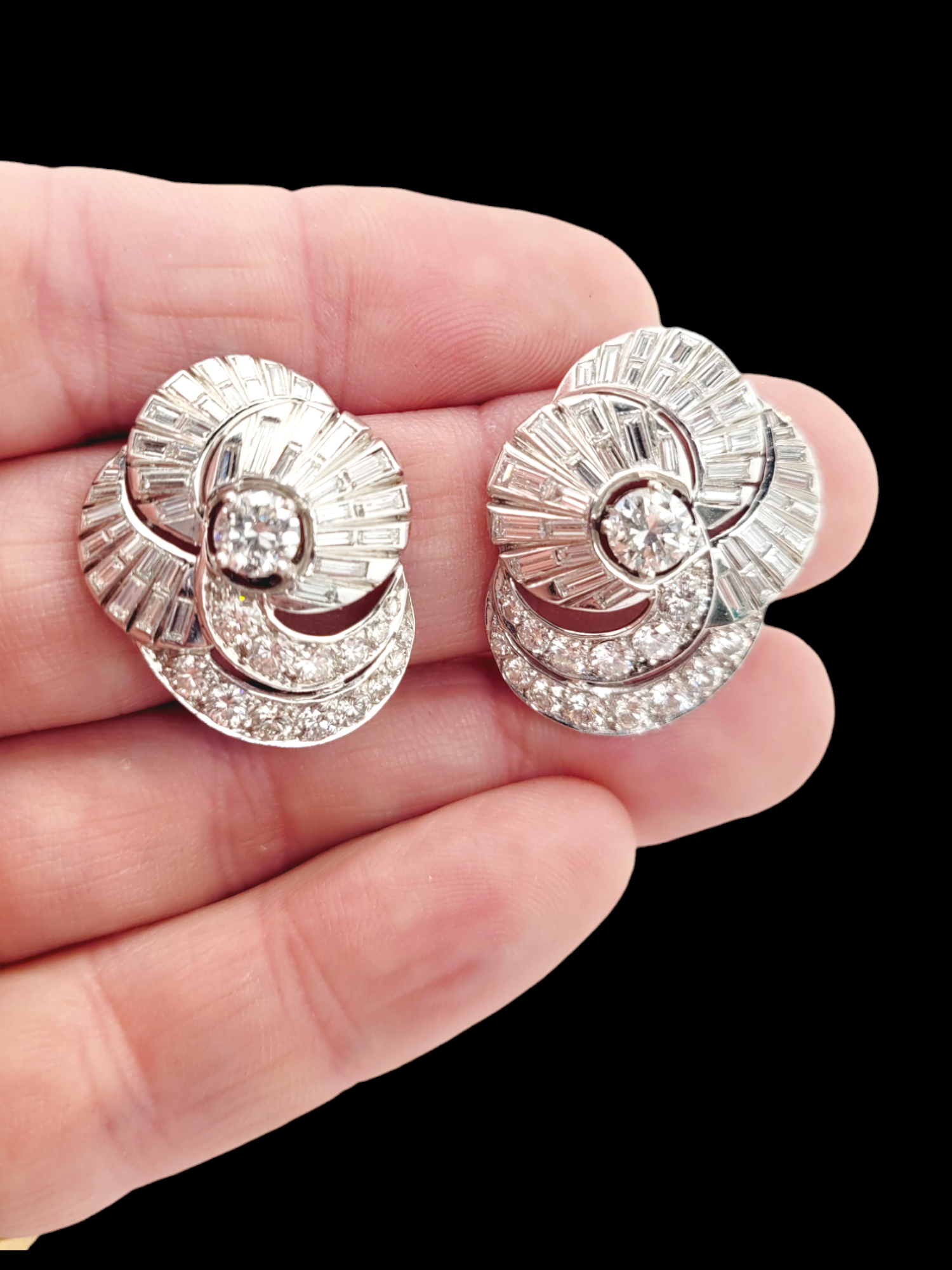Fabulous 1920s art deco baguette diamond and diamond swirl earrings, three double row crescent baguette diamonds graduating in size and shape with a central brilliant cut diamond and two graduating crescents of round diamonds. Clip fittings. 28mm x 23mm