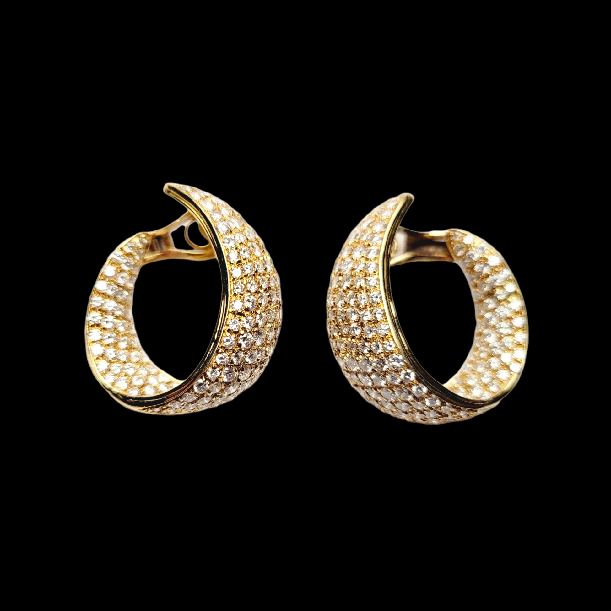 10cts of super white diamonds set in 18ct yellow gold, retailed in France circa 1970. 35mm x 30mm. Very wearable and extremely light! Can be worn for hours. The quality is superb and the shape is cleverly sculpted to achieve a sophisticated every occasion earring