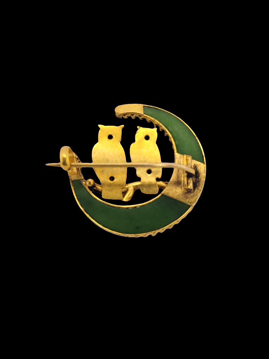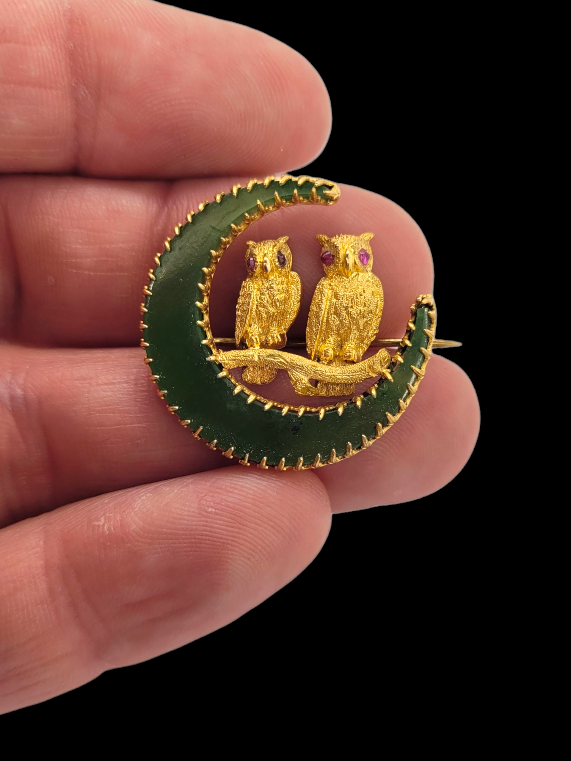Antique brooch with a Nephrite jade crescent encompassing two gold owls perched on a branch. Cabochon ruby eyes, engraved and textured. English circa 1890. 30mm diameter.