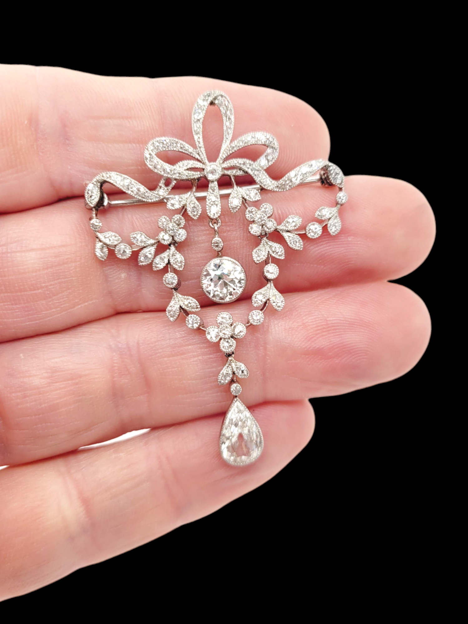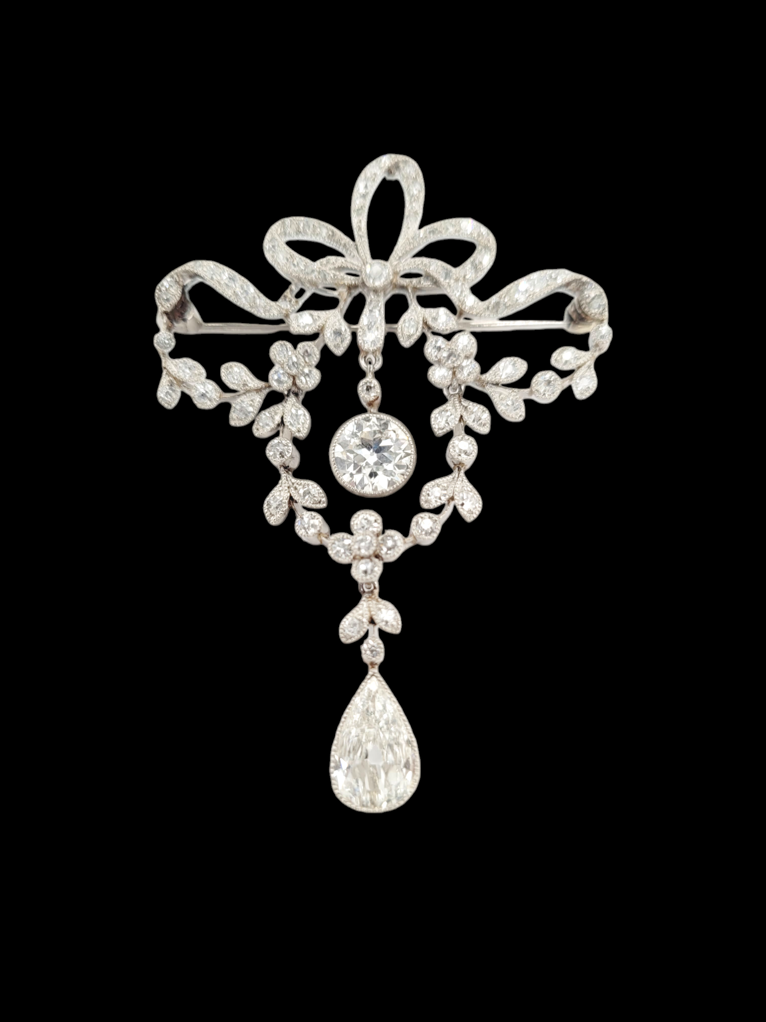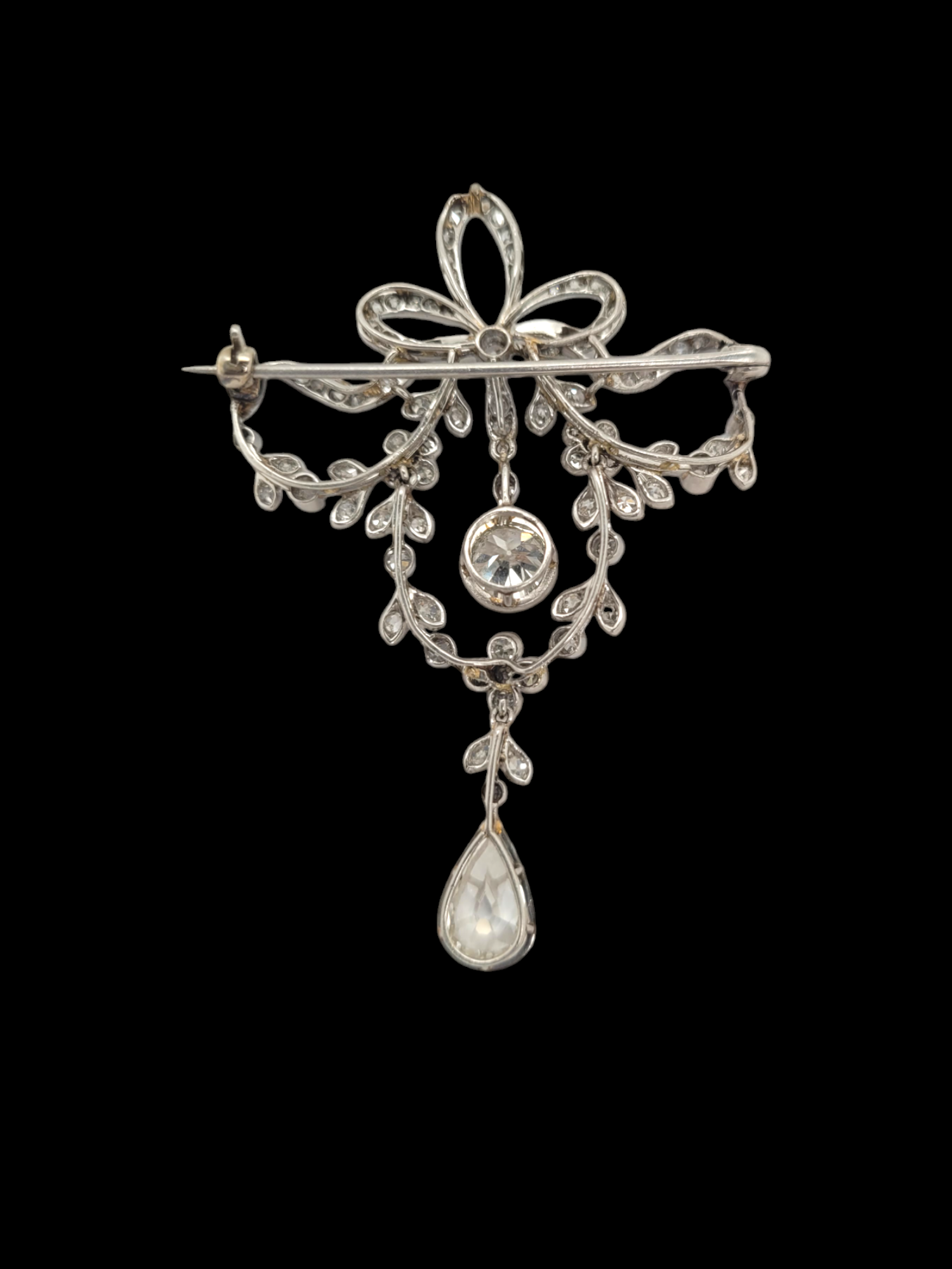 Top quality and wearable belle epoque diamond set ribbon with quatrafoil flower and leaf swag, 1ct centre old European transitional cut with charming 1ct old mine cut pear shaped drop. 3cts total diamnd weight. All milgrain set in platinum. Serial numbers engraved. Circa 1905. 40mm x 55mm