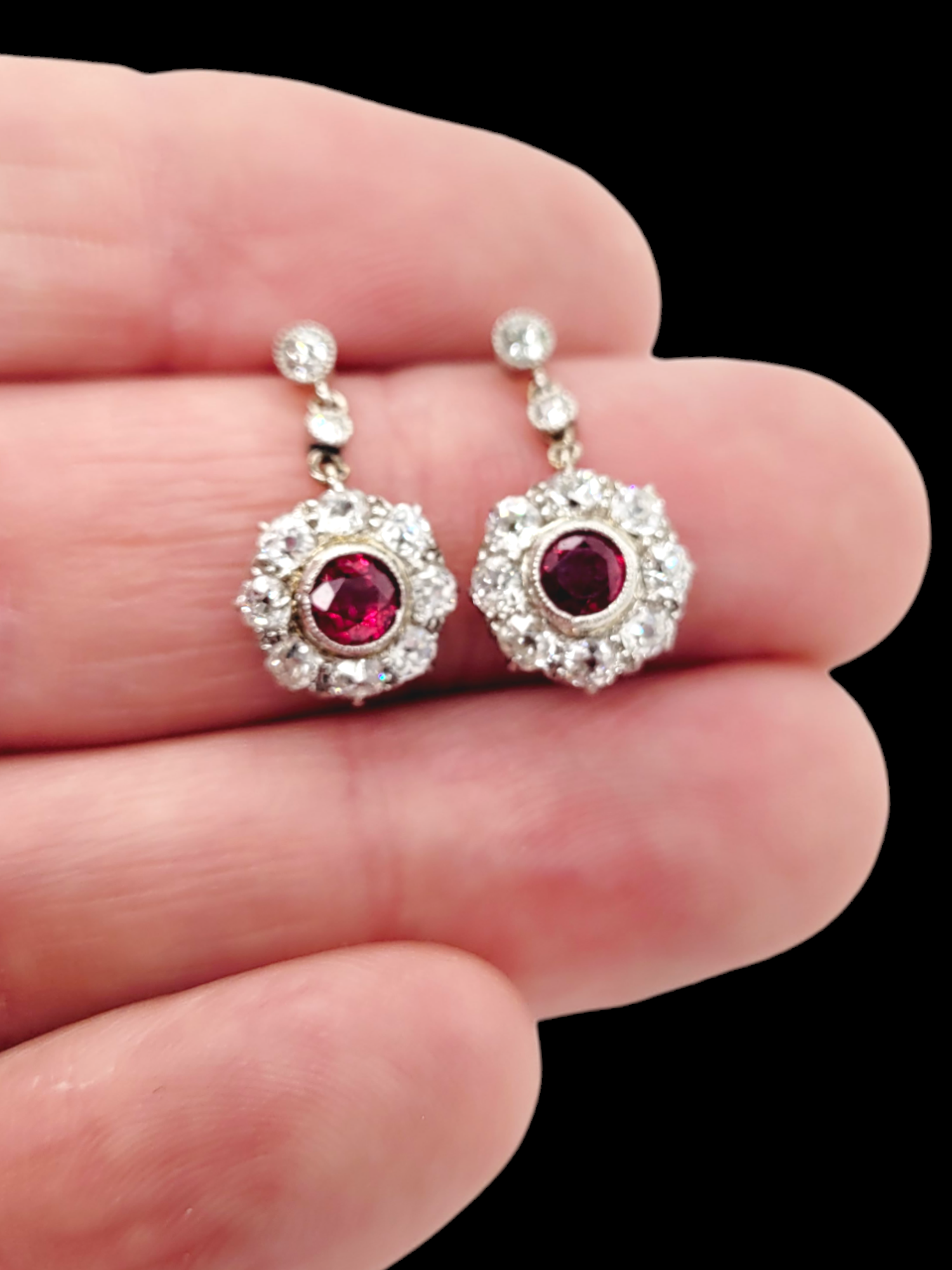 Pair of antique ruby and old mine cut diamond cluster drop earrings SKU: 7559