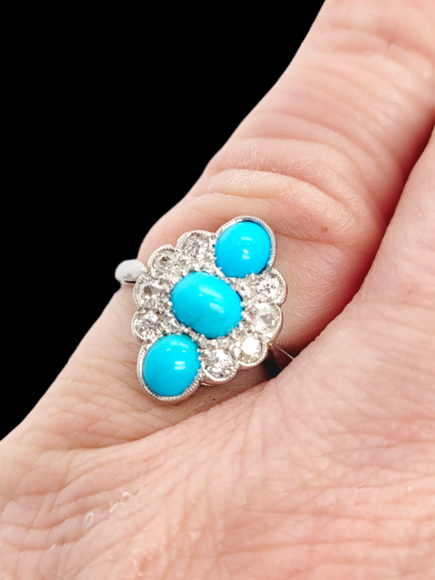 Cool art deco ring with three bright blue turquoise cabochon stones and 0.80cts old cut diamonds set in platinum and 15ct gold hallmarked, maker's mark A.H & S. English circa 1920. Head size 16.5mm x 12mm. Currently finger size M (U.S 6.25)