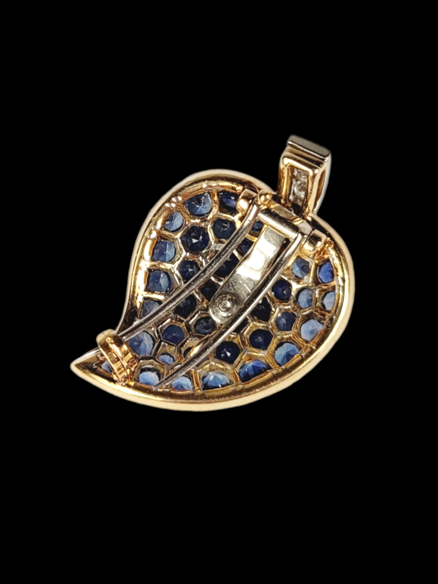 3cts of rare Montana sapphires with platinum claws set in 18ct gold with diamond stem 0.28cts. 20mm x 29mm. Honeycomb back holes, double pin clip