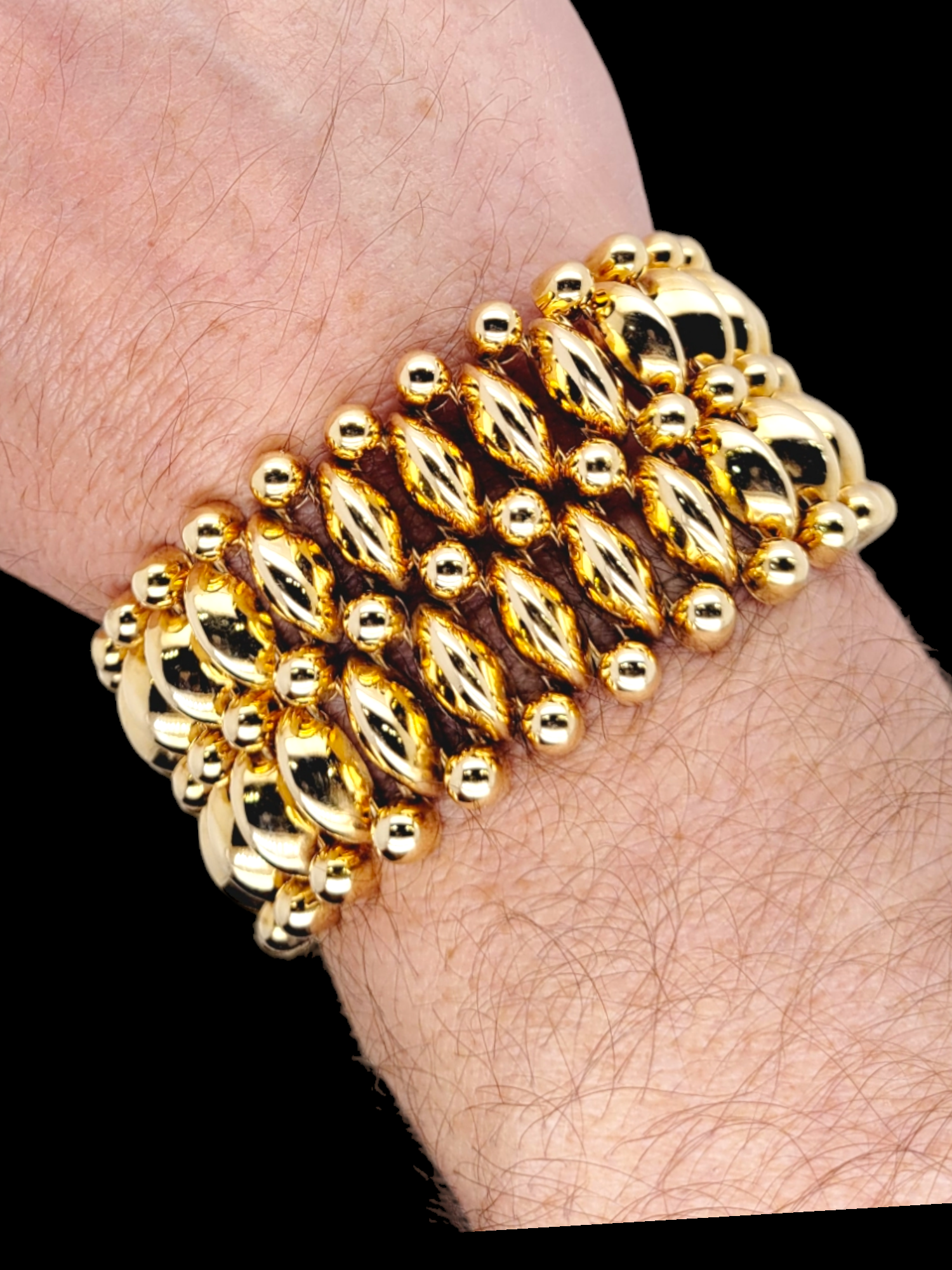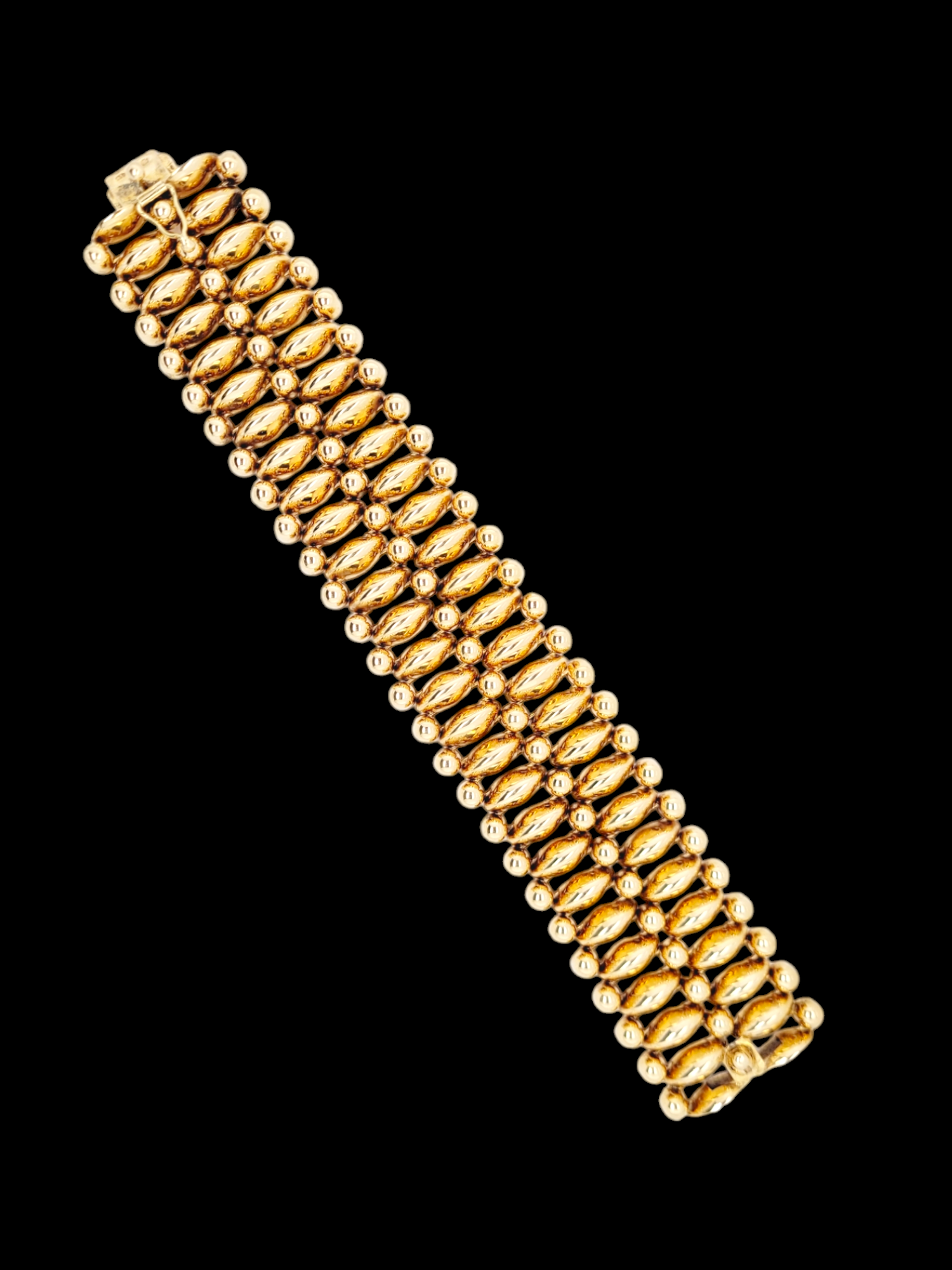 1940's 14ct gold two row oval 3D coffee bean with thre lines of golden orbs. Highly desirable cuff which exhibits great colours and style. 33mm wide. 19cms long.60.3 grams. American circa 1940. Maker's mark K.F